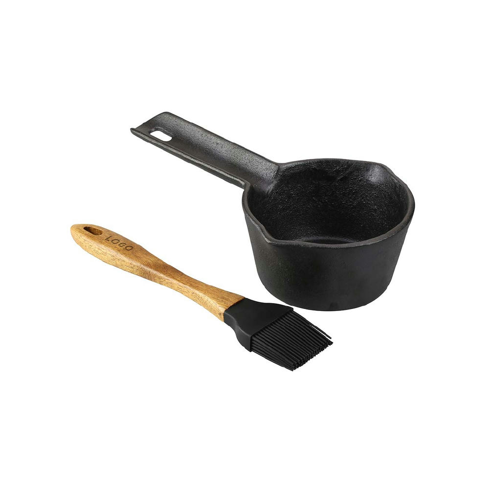 Set aus einem gusseisernen Tiegel mit passendem Marinier-Pinsel (spülmaschinenfest) und Rezeptheft mit tollen Rezeptideen rund um Marinaden, Dips & Co.. Die kompakte Ironpan eignet sich ideal für das Schmelzen von Butter oder Käse sowie zum Erwärmen von Grillsoßen. Ab. 2.000 St. ist das Rezeptheft mit eigenem Titel individualisierbar.