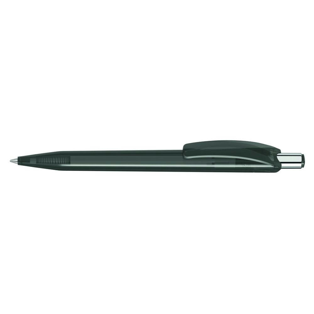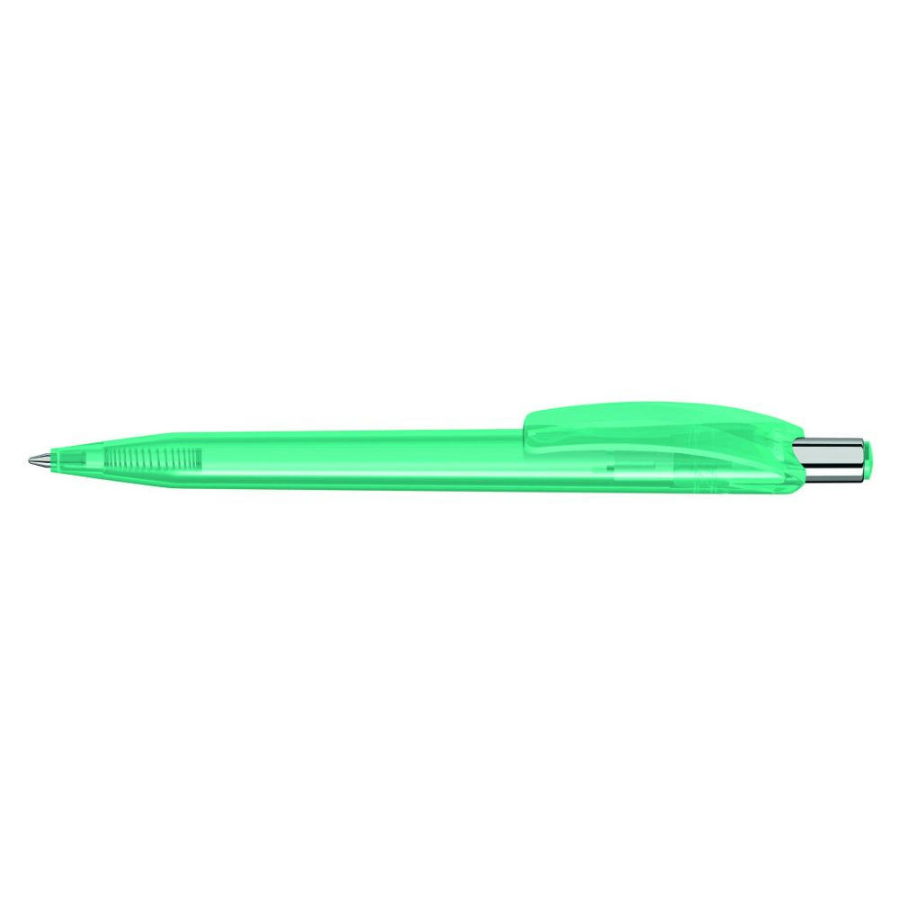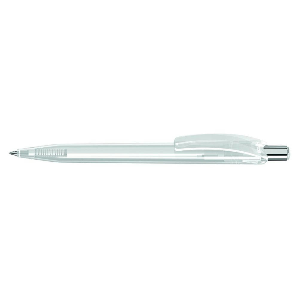 Druckkugelschreiber mit glänzend transparentem Gehäuse und Drückerstopfen. Drücker in silber glänzend.