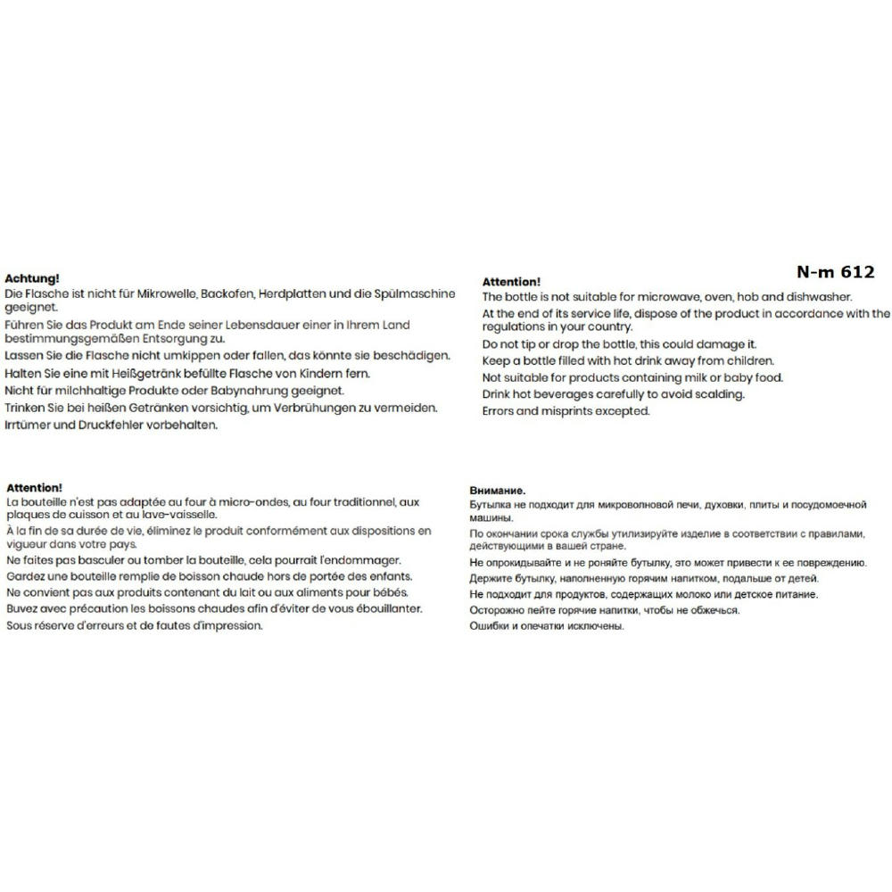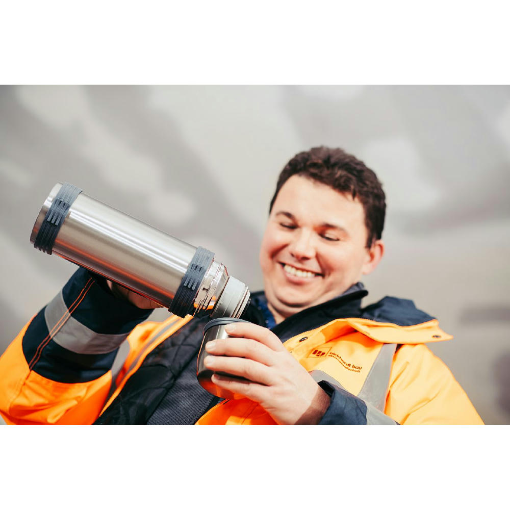Vakuumflasche mit Schraubdeckel als Trinkbecher und stabilem Klappgriff.