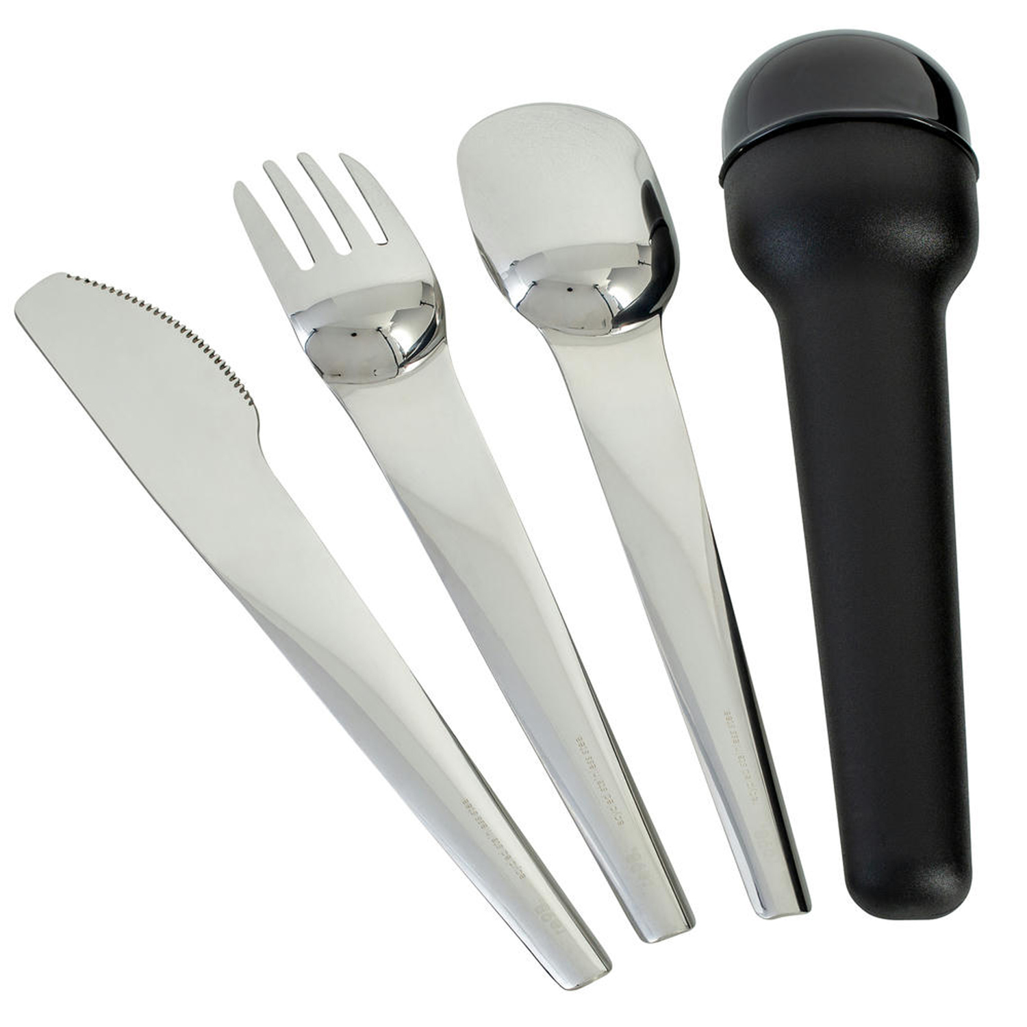 Nach dem Gebrauch kann das Set wieder in der handlichen Box verstaut werden. Die Box besteht aus recyceltem Polypropylen und recyceltem Polycarbonat und ist in den Farben Schwarz, Dunkelblau, Rot oder Weiß erhältlich. Verschlossen mit einer transparenten Kappe aus PC, lässt sich diese durch leichten Druck auf der flachen Rückseite öffnen und abnehmen (gekennzeichnet durch „Press“). Als Zusatzfunktion kann die Box als Messerbank verwendet werden und schützt dadurch die Besteckköpfe vor Kontakt mit dem Untergrund. So können Sie in jeder Umgebung hygienisch das Besteck nutzen. Zur Reinigung können alle Bestandteile in der Spülmaschine gereinigt werden.