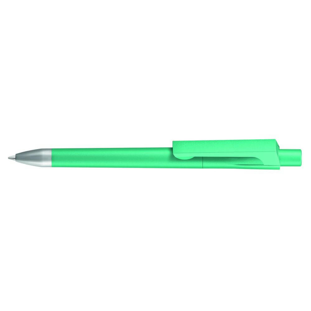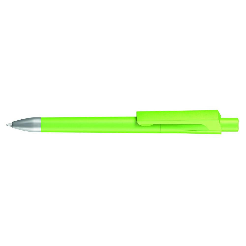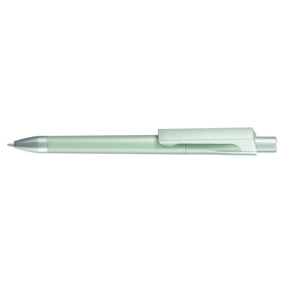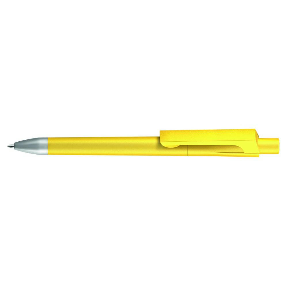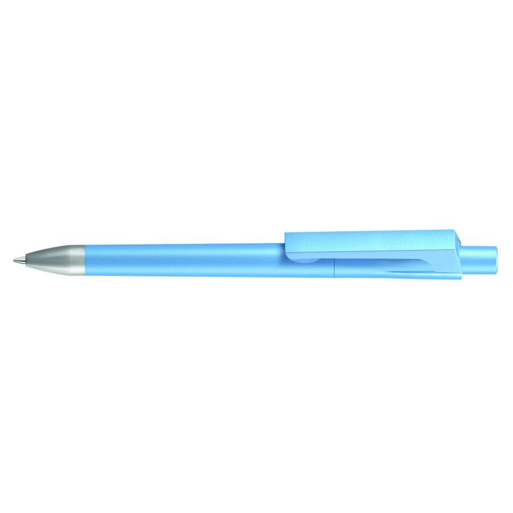 Druckkugelschreiber mit gedeckt mattem Gehäuse und schwerer Metallspitze matt verchromt.