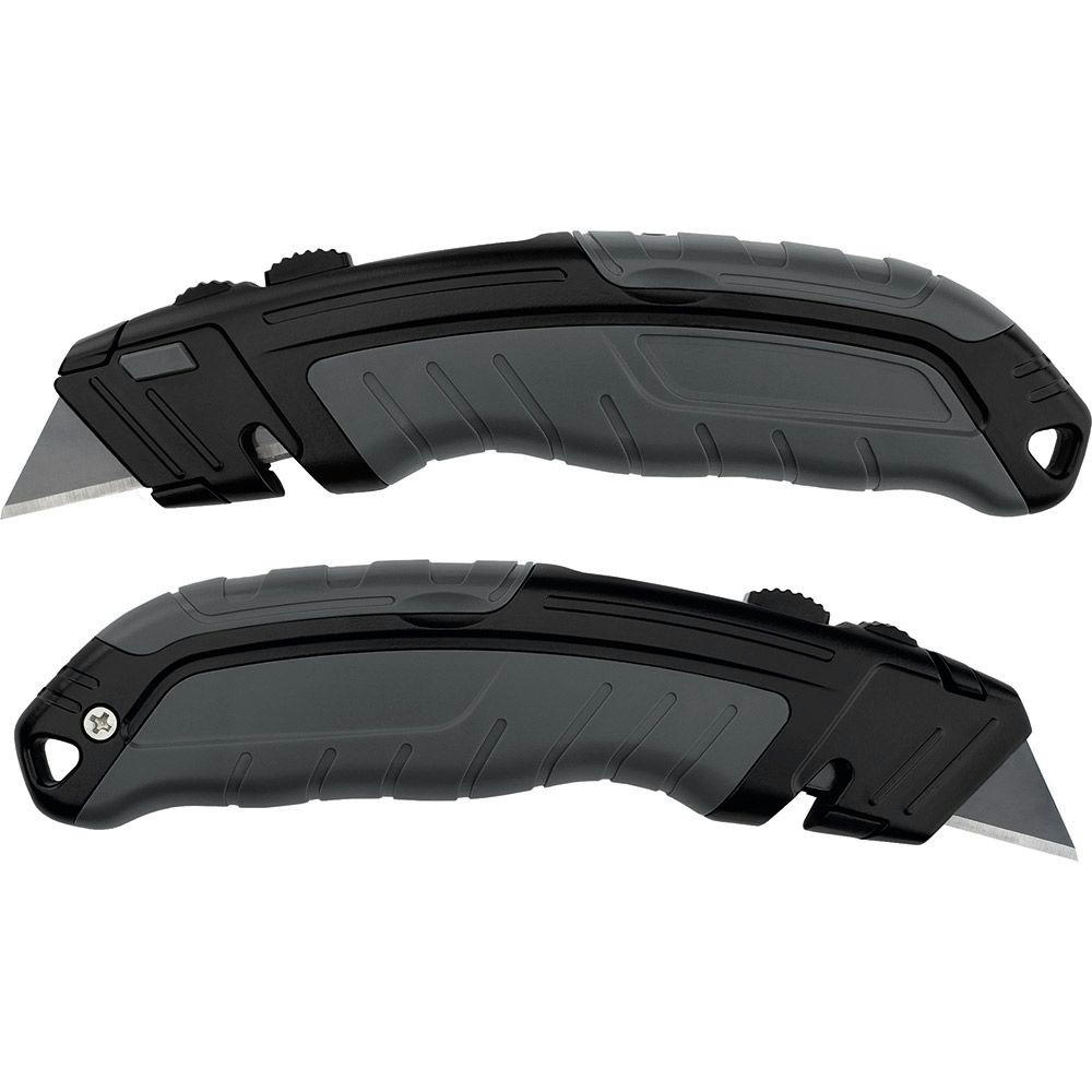Universal-Trapezklingenmesser mit SK2 Hochleistungsklingen. Hochwertiges Qualitäts-Cuttermesser mit Aluminiumgehäuse und 3-fach arretierbarem Klingenausschub. Für Rechts- und Linkshänder geeignet.