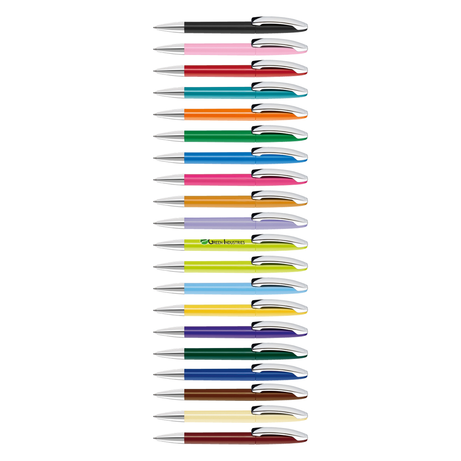 Drehkugelschreiber mit gedeckt glänzendem Gehäuse, Metallclip und Spitze glanzverchromt.