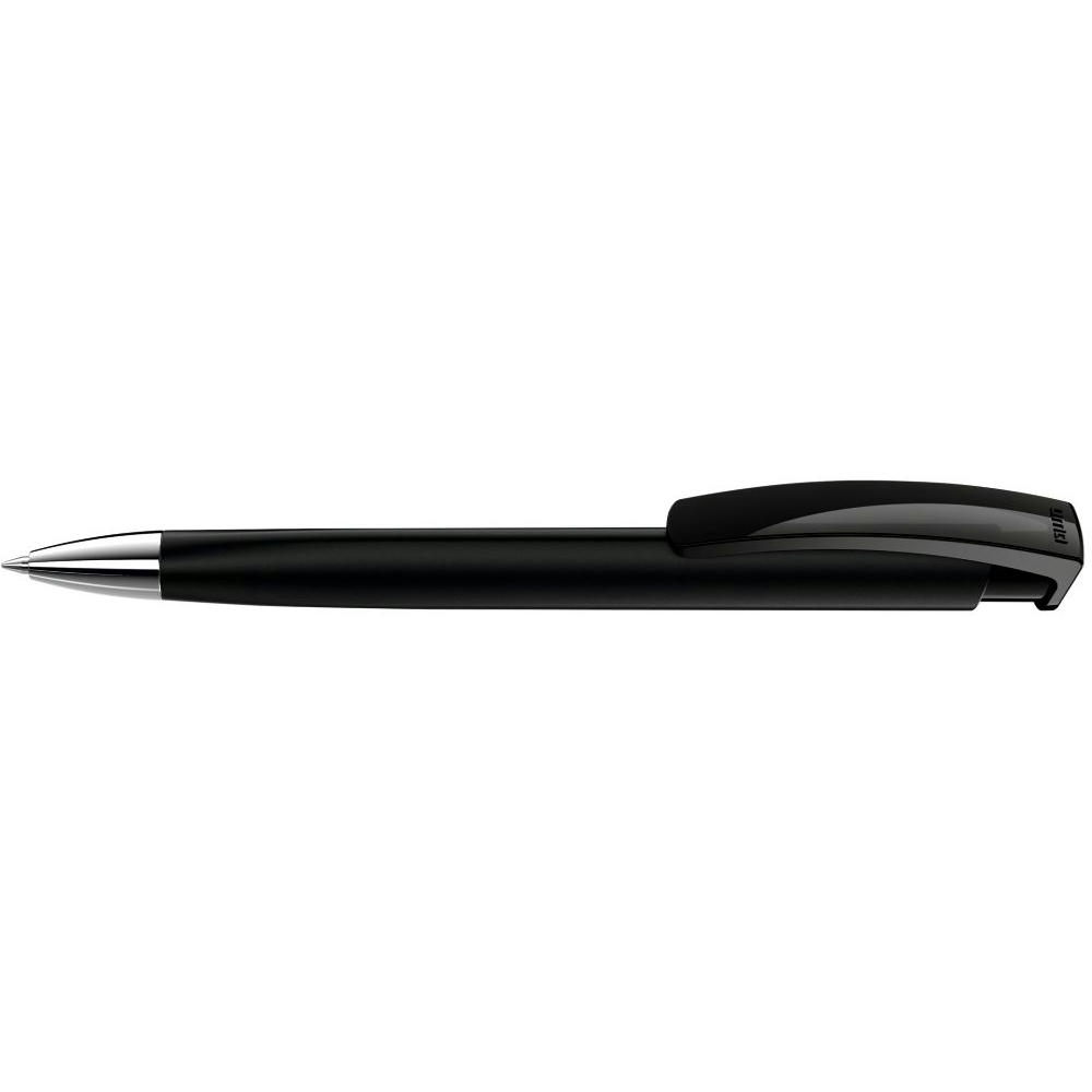 Druckkugelschreiber mit gedeckt glänzendem Dreikantgehäuse und schwerer Metallspitze glanzverchromt.