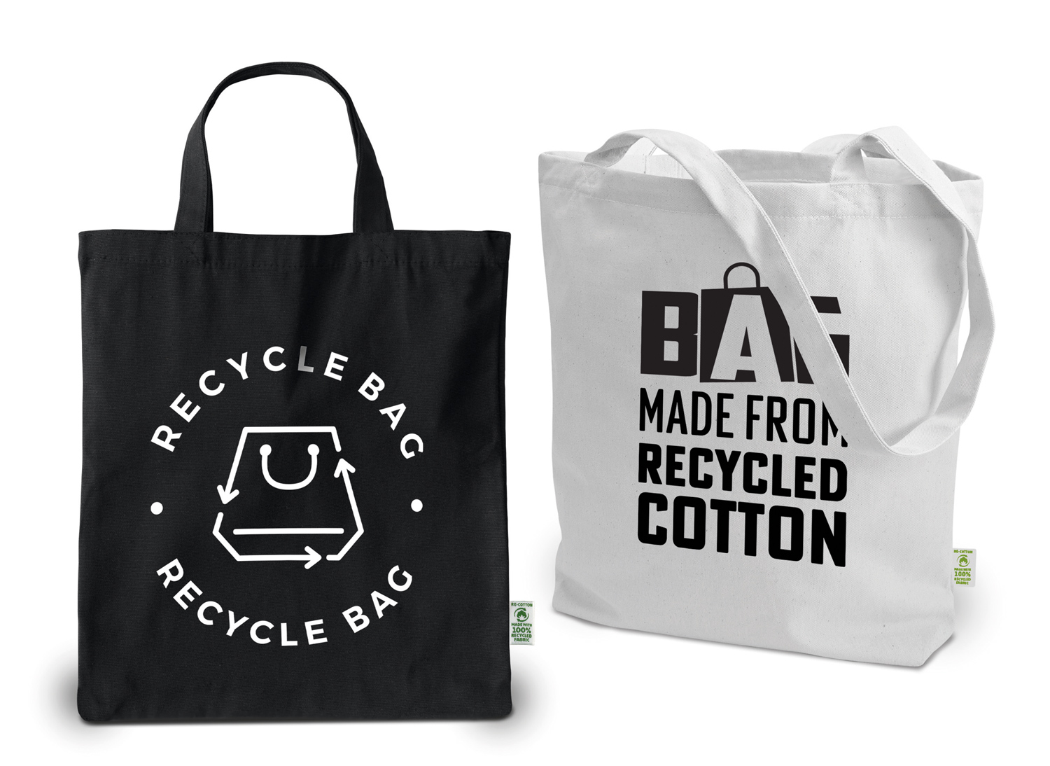 Tasche aus recycelter schwerer Baumwolle mit kurzen im Kreuzstich vernähten Henkeln und RE-cotton label aussen. Gegen Aufpreis auch mit langen Henkeln erhältlich.