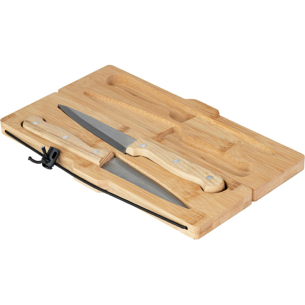 Material: naturbelassenes Bambus, Edelstahl. Maße: 29 x 9,3 x 3,1 cm (geschlossen), 29 x 18,6 x 1,55 cm (geöffnet).