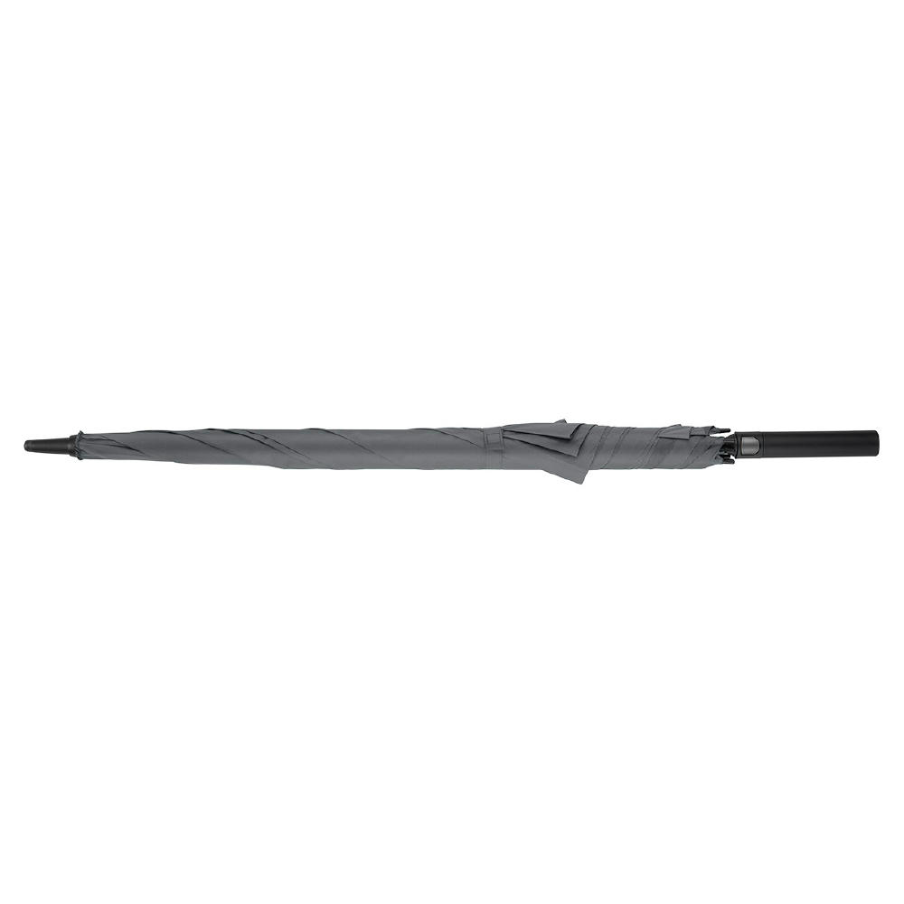 Dieser hochwertige Regenschirm verfügt über eine Bespannung aus 190T rPET-Pongee und einen Durchmesser von ca. 130 cm. Im geschlossenen Zustand misst er ca. 99 cm. Mit einer praktischen Automatikfunktion öffnet er sich schnell und einfach. Dank der Windproof-Funktion bleibt der Schirm auch bei windigen Bedingungen stabil. Der gerade schwarze Griff aus Kunststoff mit PU-Beschichtung und die Kunststofftips und -spitze in Schwarz runden das elegante Design ab.