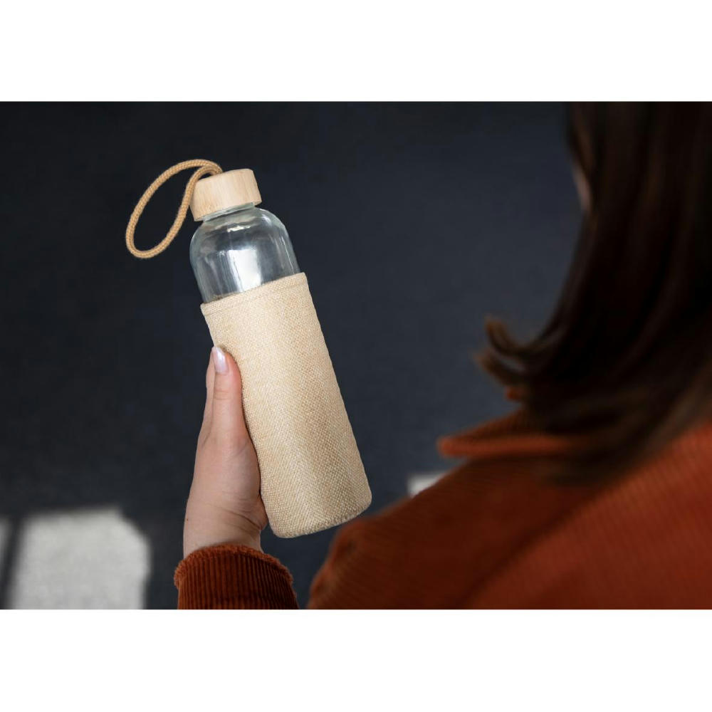 Große Trinkflasche aus Sodalime-Glas inklusive Schraubverschluss aus Bambus mit praktischer Schlaufe. Die griffige Hülle in natürlichem Look hält die Temperatur des Getränks länger konstant. Außerdem bietet sie bei heißem Inhalt zusätzlichen Schutz vor der erwärmten Oberfläche. Füllmenge: 0,70 Liter.