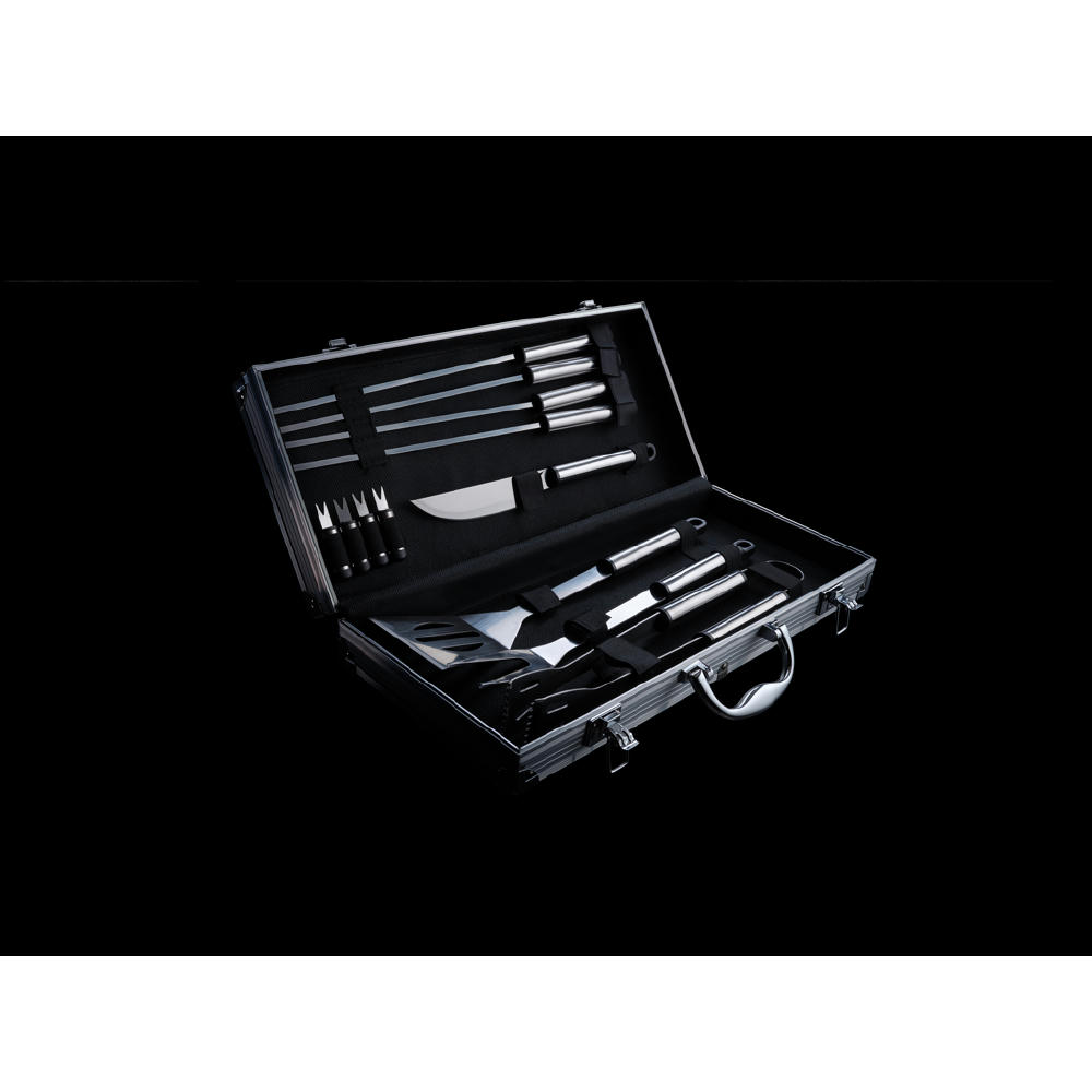 12-teilig, Aluminiumkoffer, BBQ, Bratenheber, Edelstahl, Grillgabel, Grillzange, Grillzubehör, Maiskolbenhalter, Messer, Outdoor, Spieße, grillen, set