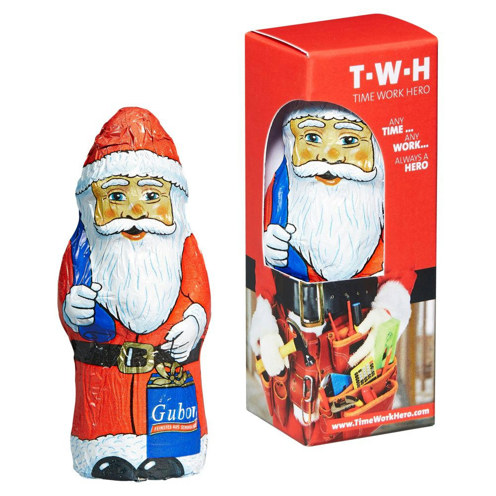 Hohlfigur, verpackt in Werbegeschenkbox mit Sichtfenster über Eck. Solange der Vorrat reicht. Geschmack: Edelvollmilchschokolade mit mindestens 32 % Kakao. Inhalt: 1 Stück á ca. 20 g. Maße: ca. 3,45 x 9,2 x 3,15 cm. Haltbarkeit: ca. 6 Monate.