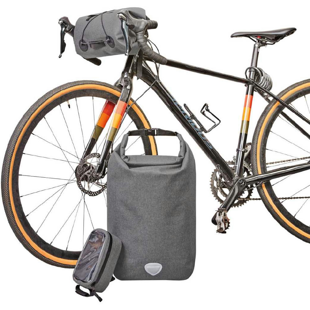 Urbane Fahrradtasche mit geräumigem Hauptfach; große Reißverschluss-Innentasche; Rolltop-Verschluss; geschweißte Nähte für zuverlässigen Schutz vor Regenwasser und Nässe; Boden- und Kantenschutz; individuell einstellbare Halterung zur Befestigung am Fahrrad-Gepäckträger mit Drehriegel zur Sicherung und Klettverschluss auf der unteren Taschenrückseite für zusätzliche Fixierung; dekorative Reflektorapplikation; Handgriff.