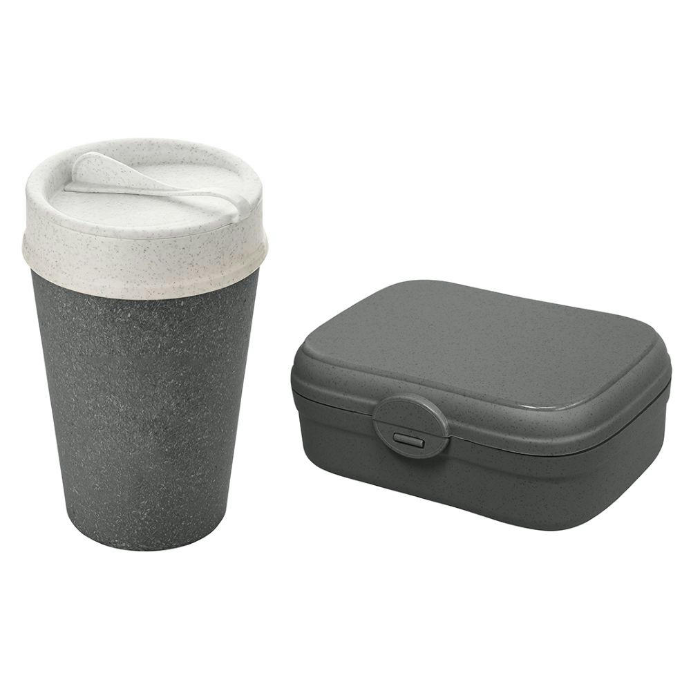 Set aus Kaffeebecher und Lunchbox. Der doppelwandige Becher hält den Kaffee lange auf Genusstemperatur, ist angenehm leicht und nahezu unzerbrechlich. Dank flexibler Lamellen sitzt der Deckel wie angegossen auf der Tasse und ermöglicht komfortablen Trinkgenuss. In der kompakten Lunchbox finden Sandwiches, Snacks und Obst einen Platz und sind immer frisch aufbewahrt.