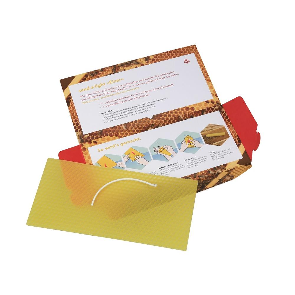 Bastelset für eine Kerze aus reinem Bienenwachs in eigengestalteter DIN lang Mappe. Inkl. Bastelanleitung und Einleger mit Sicherheitshinweisen. Preis inkl. vierfarbigem Druck innen und außen.
