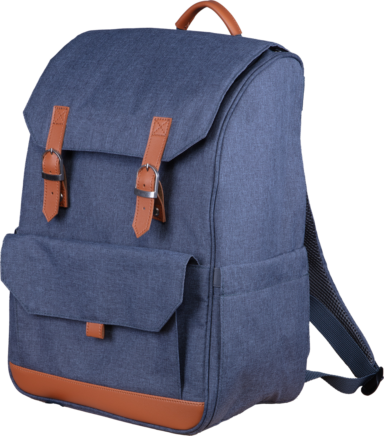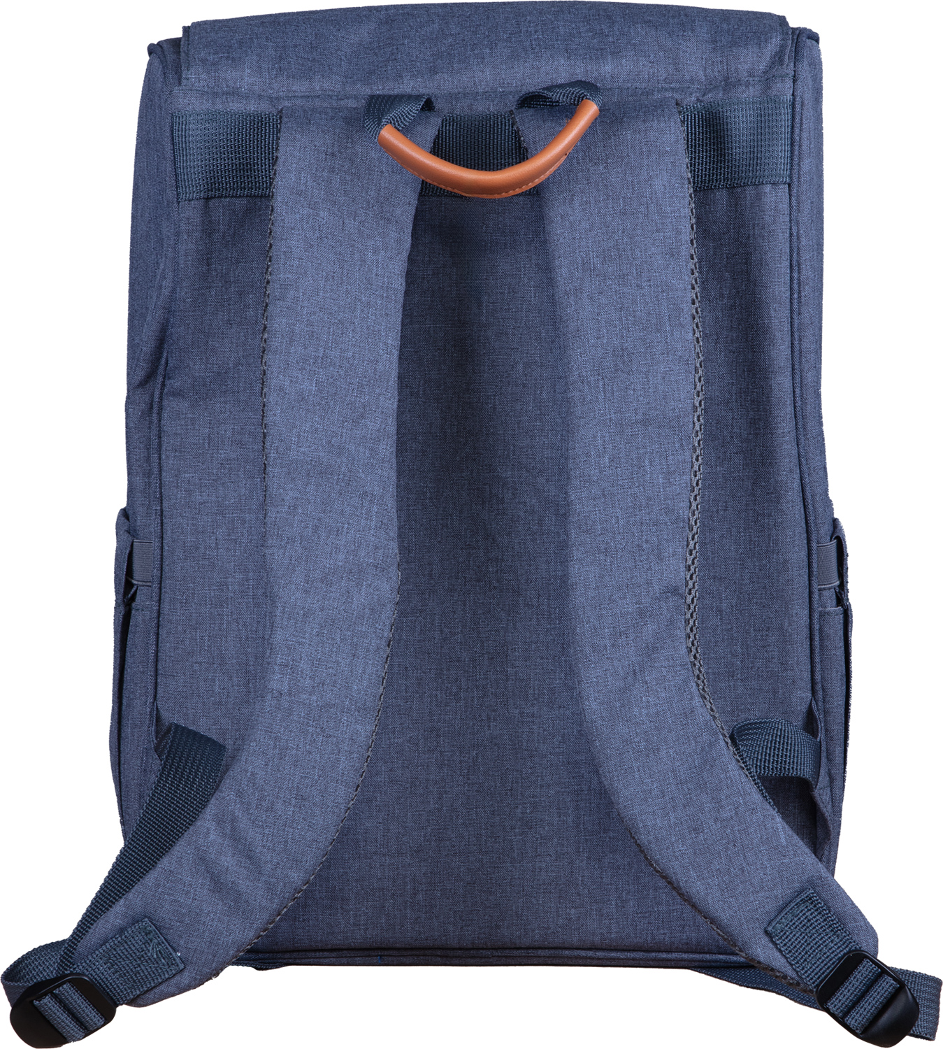 Kühlrucksack aus recyceltem Polyester 300D (RPET) mit hellbraunen Kunstleder-Schnallen, thermoisoliertem Innenraum (PEVA), sowie einem Front-Klettfach und zwei Seitentaschen für Flaschen, Schirme etc.