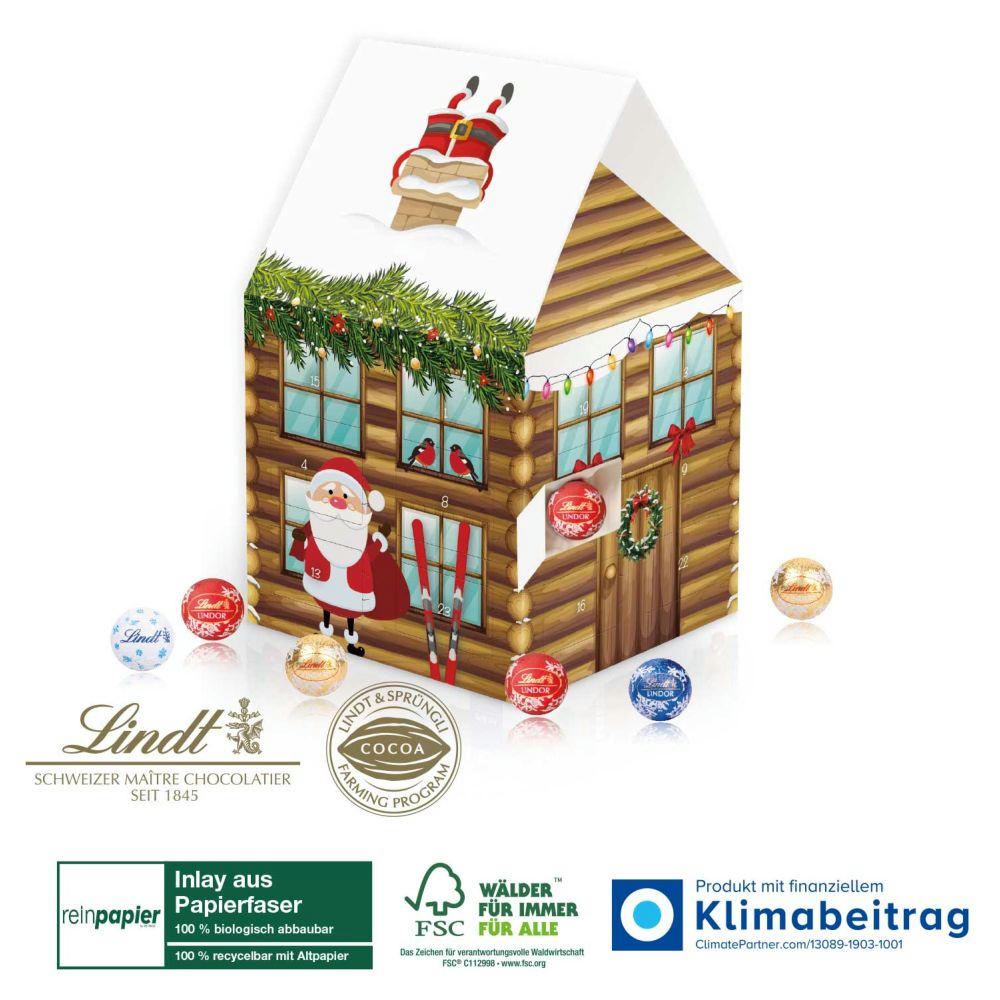 Adventskalender in Haus-Form. 24 Stück (ca. 110 g) LINDT „Minis“ versprechen himmlischen Schokoladengenuss. Geschmacksrichtungen bunt sortiert. Produkt mit finanziellem Klimabeitrag. Preis inkl. 4c-Druck.