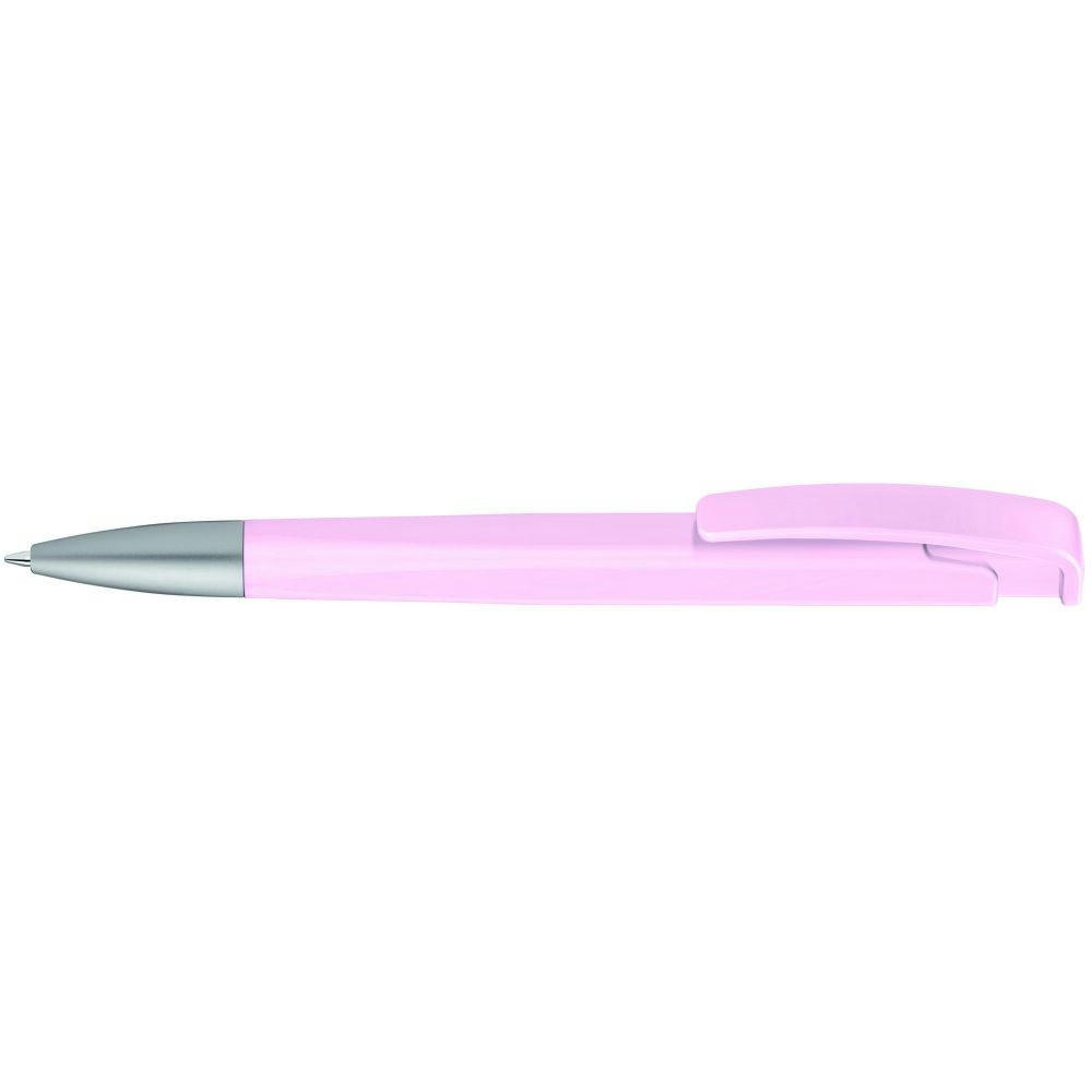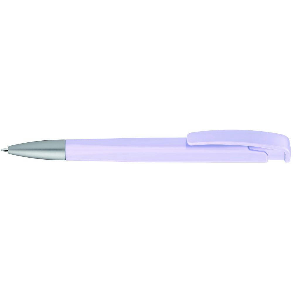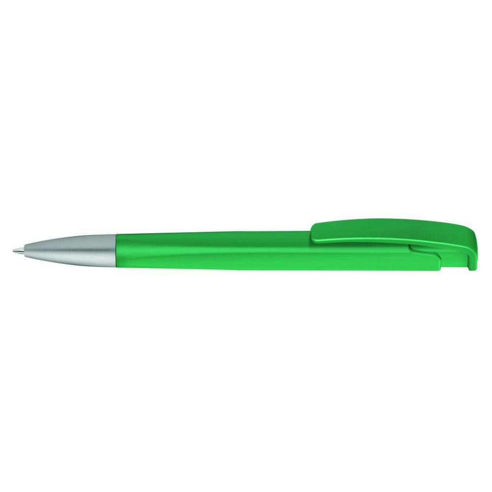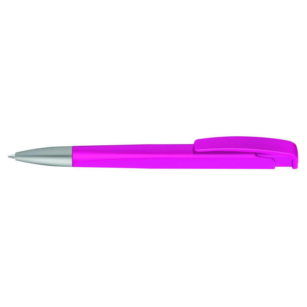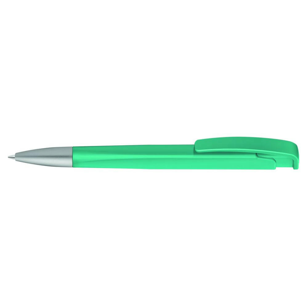 Druckkugelschreiber mit geometrisch wechselnder Schaftform, matt gedecktem Gehäuse und Metallspitze matt verchromt.