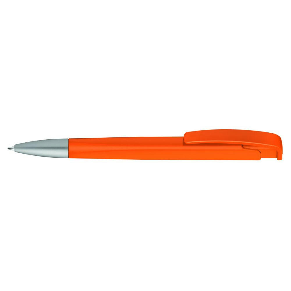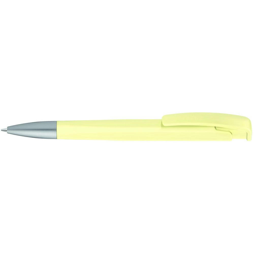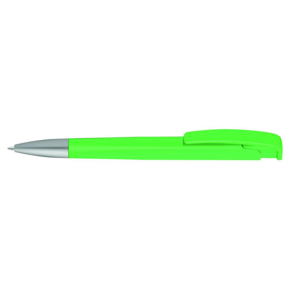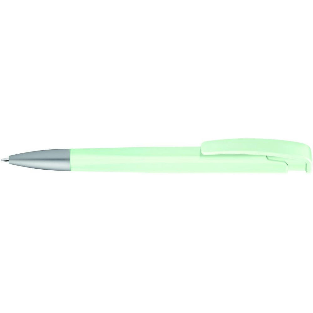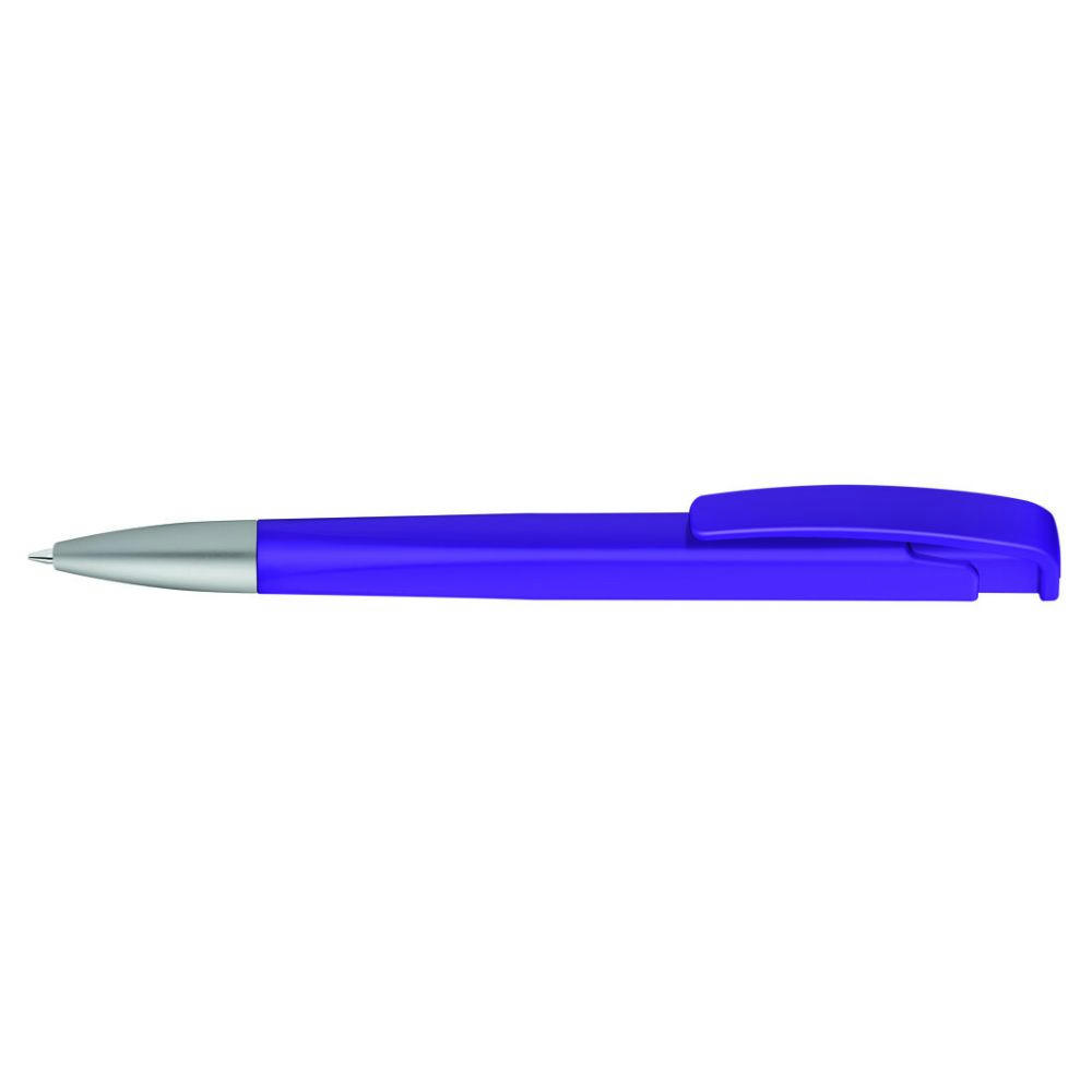 Druckkugelschreiber mit geometrisch wechselnder Schaftform, matt gedecktem Gehäuse und Metallspitze matt verchromt.
