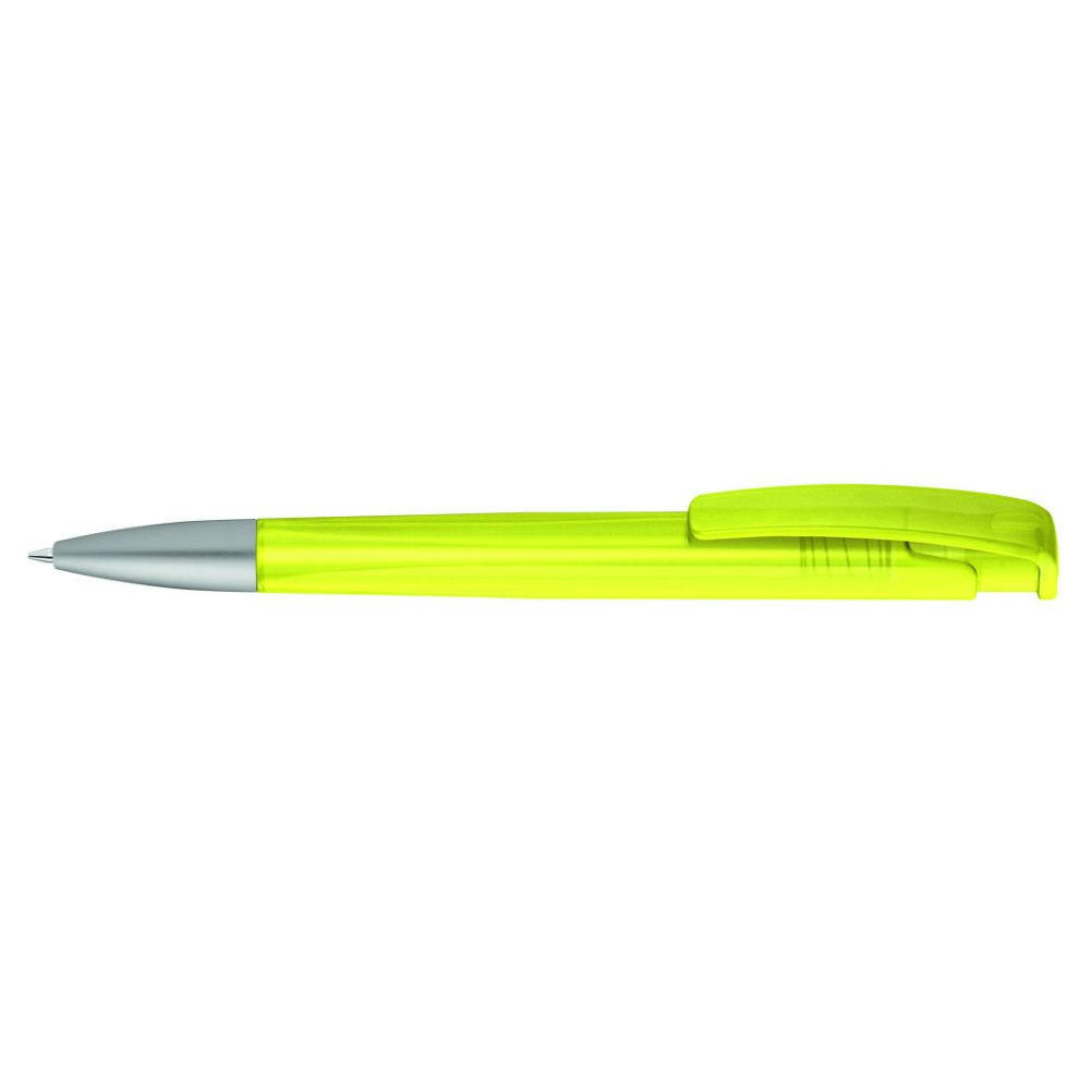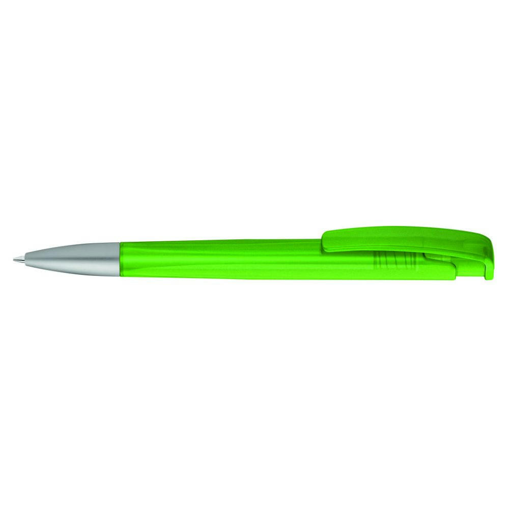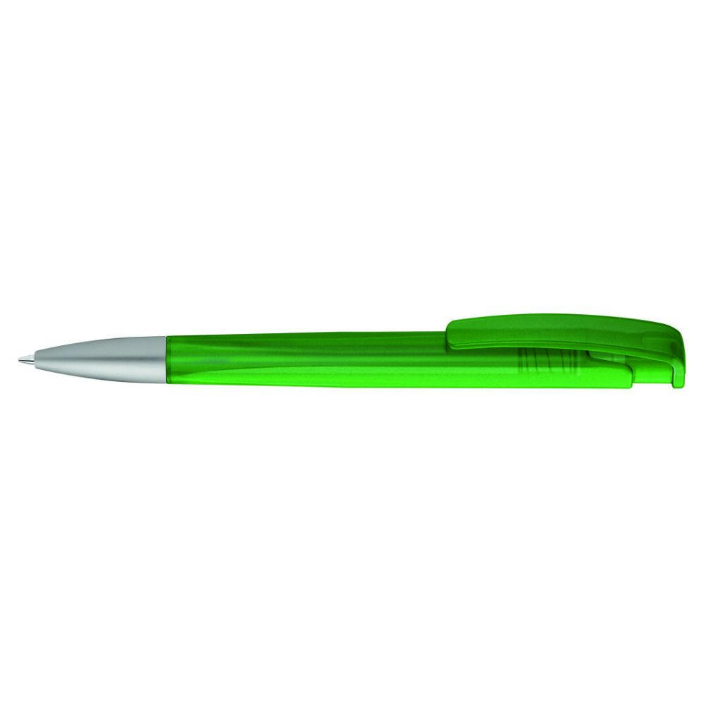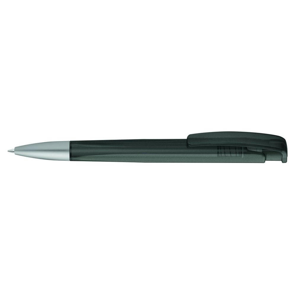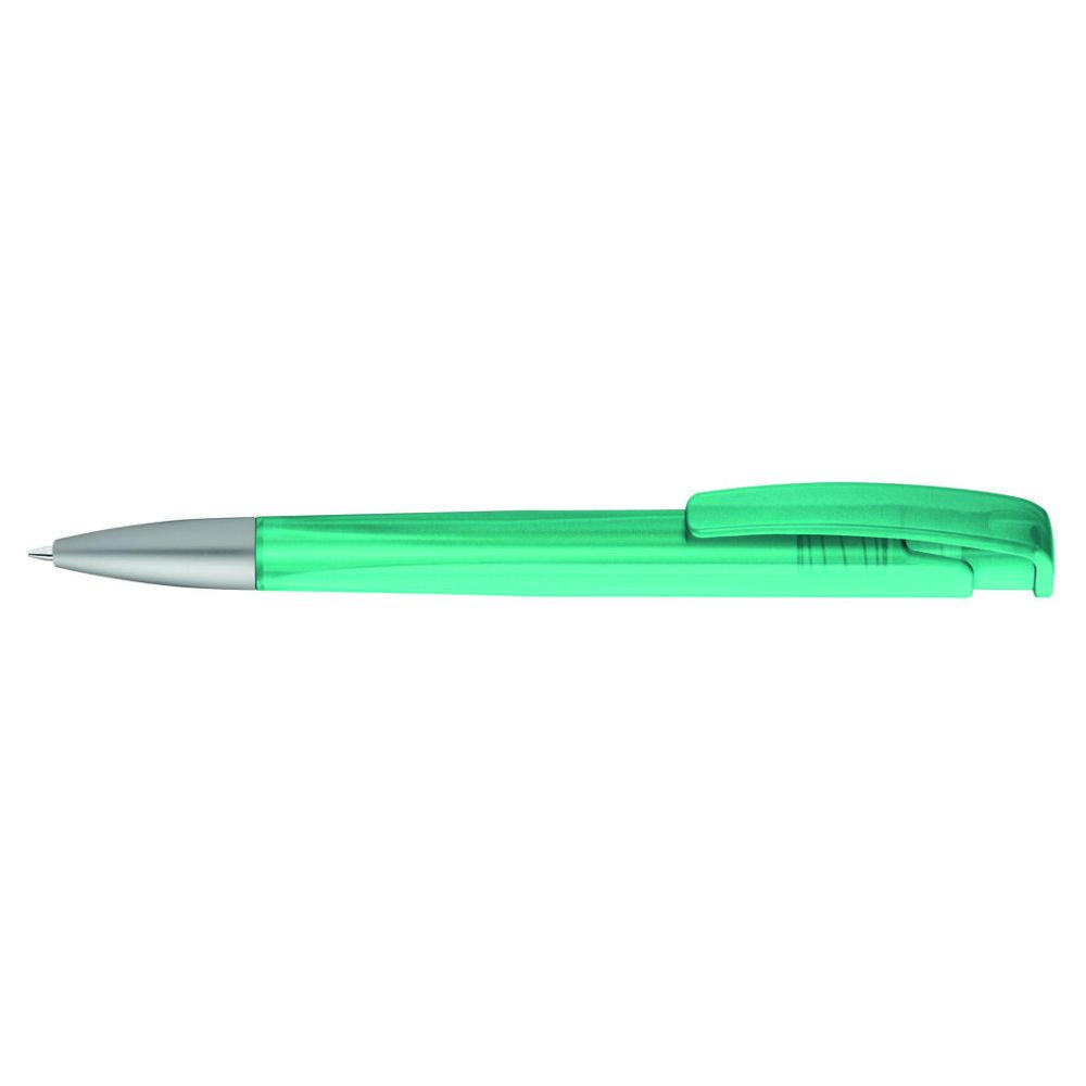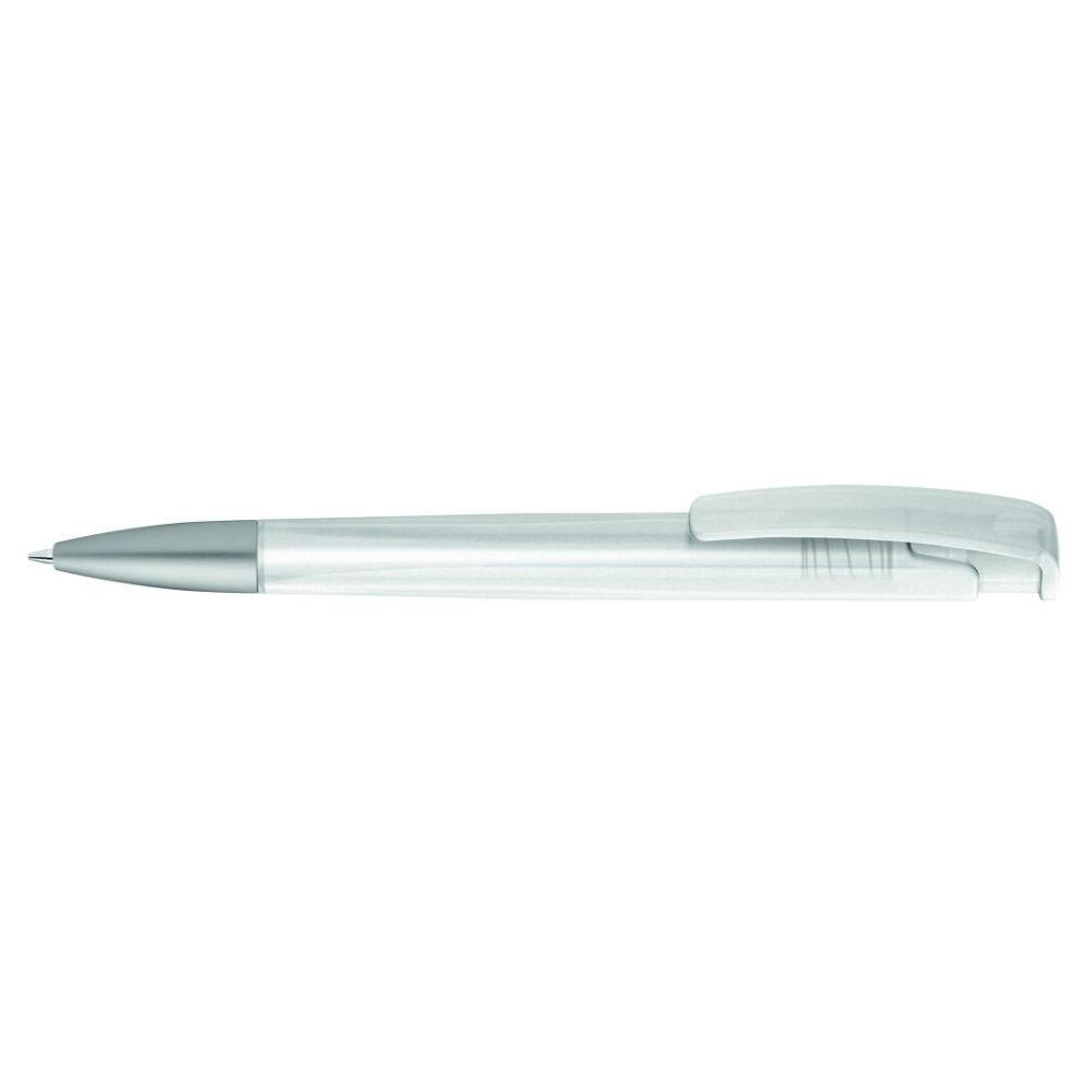Druckkugelschreiber mit geometrisch wechselnder Schaftform, transparent gefrostetem Gehäuse und Metallspitze matt verchromt.