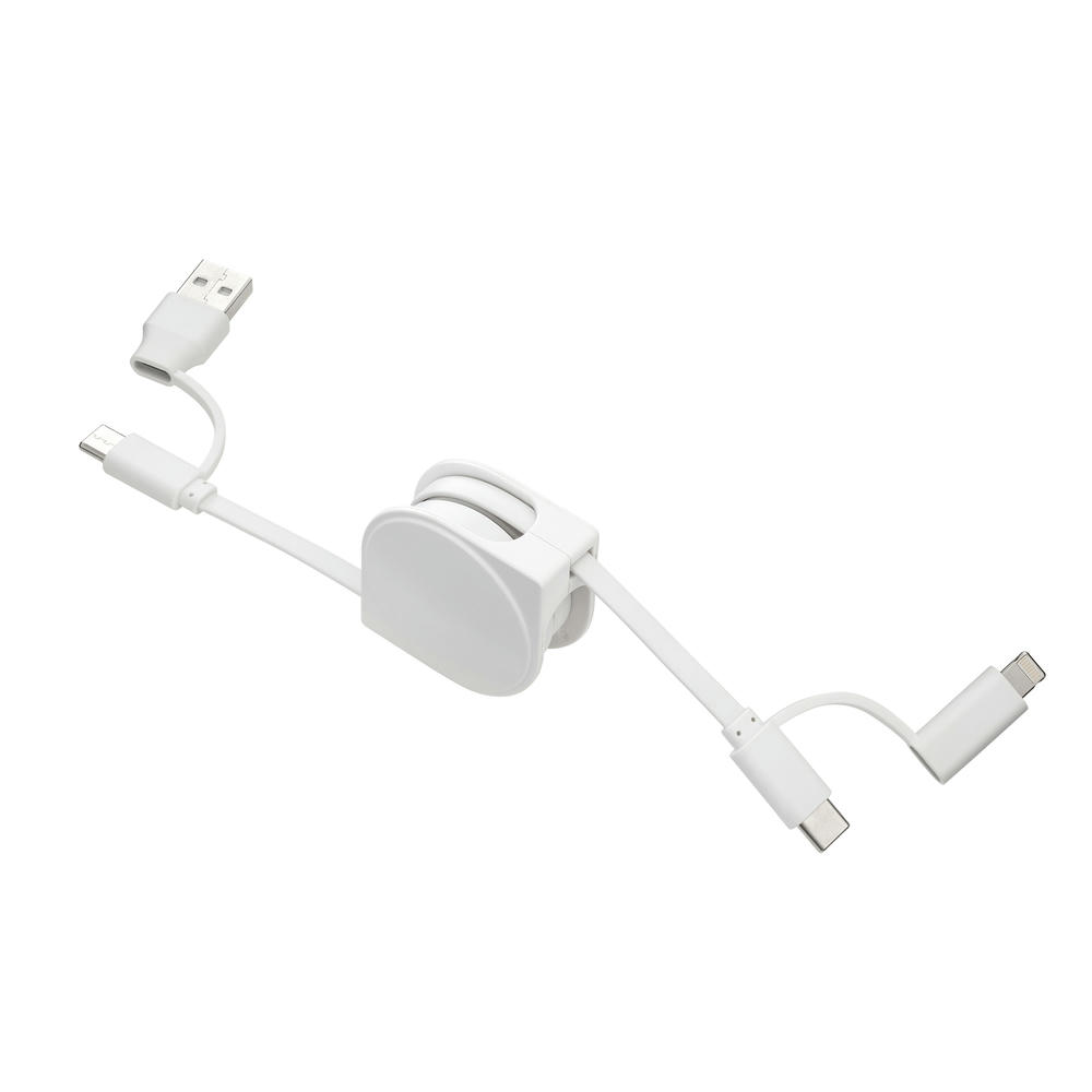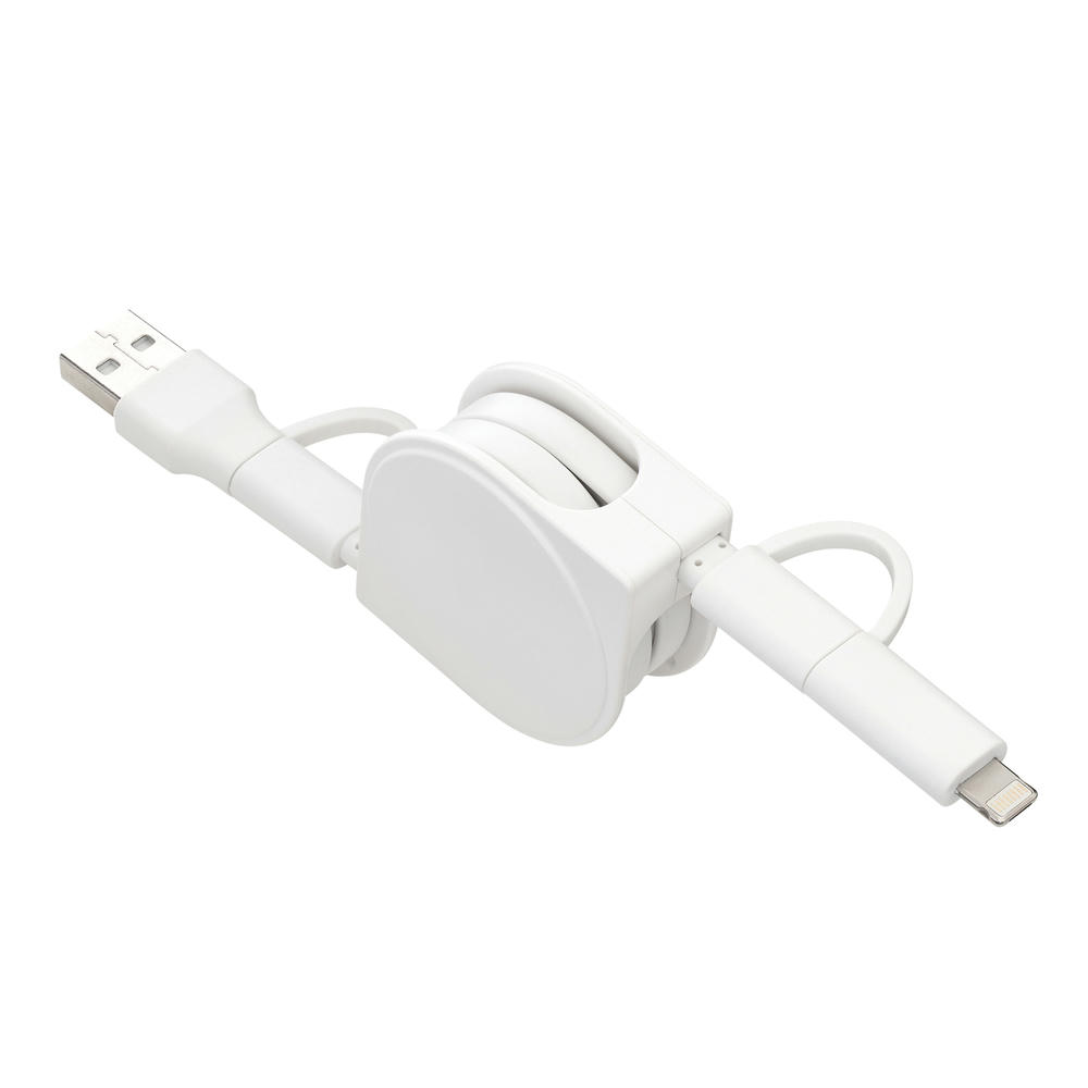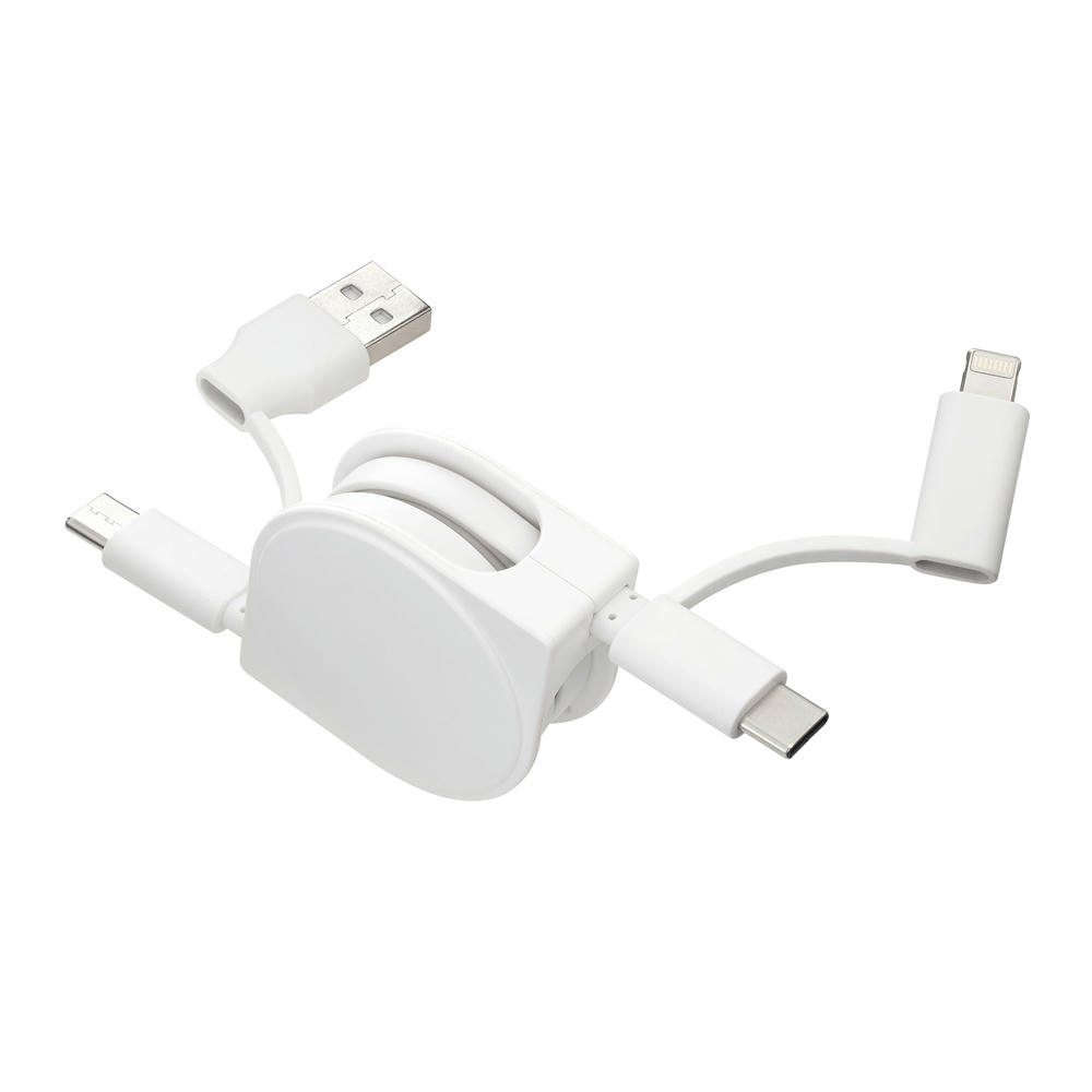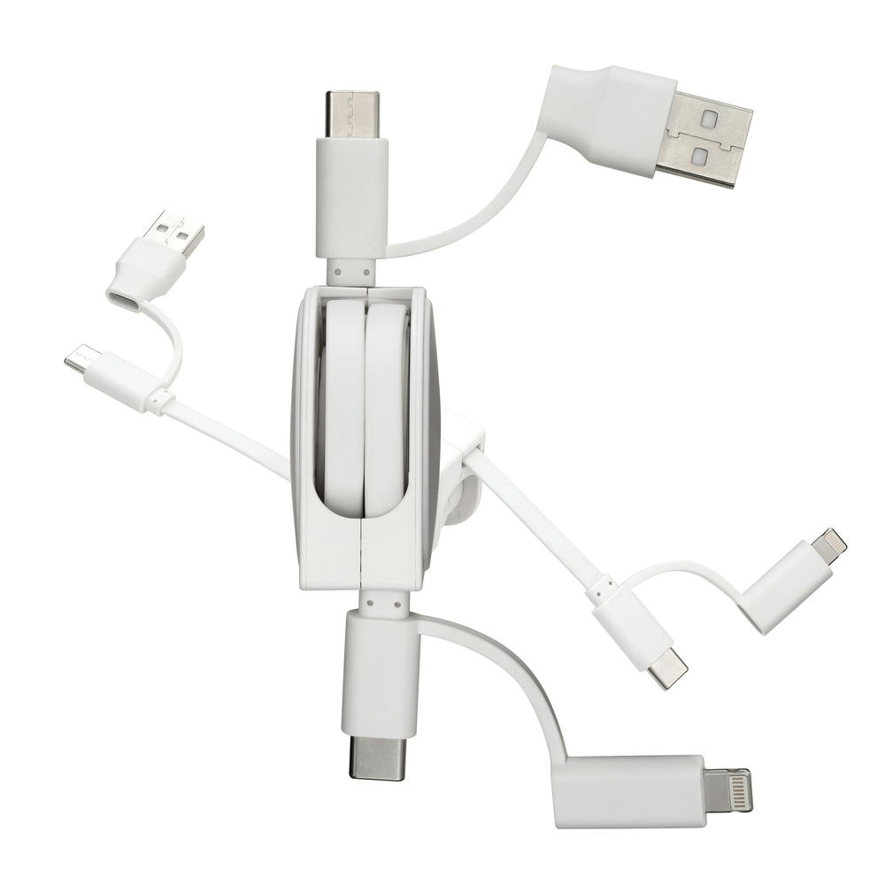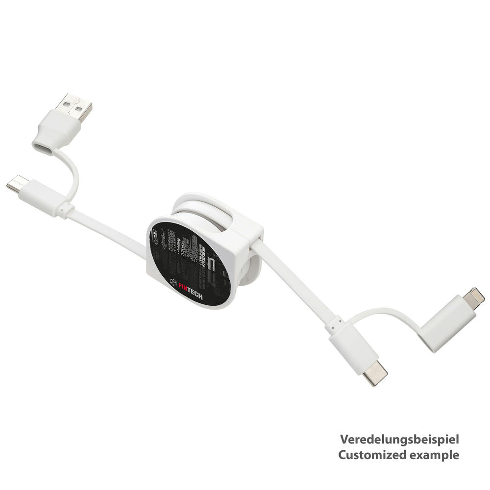 Ladekabel mit Möglichkeit zum Datentransfer. USB-C auf USB-C Kabel mit Adapter auf USB-A auf der einen Seite. Auf der anderen Seite hat das Kabel einen 2-in-1-Adapter für Micro-USB und Apple® 8 Pin*. *Apple® is a registered trademark of Apple Inc., registered in the US and other countries.