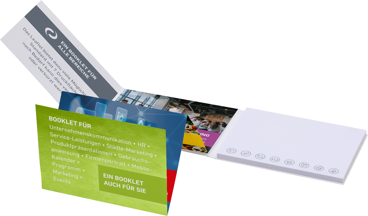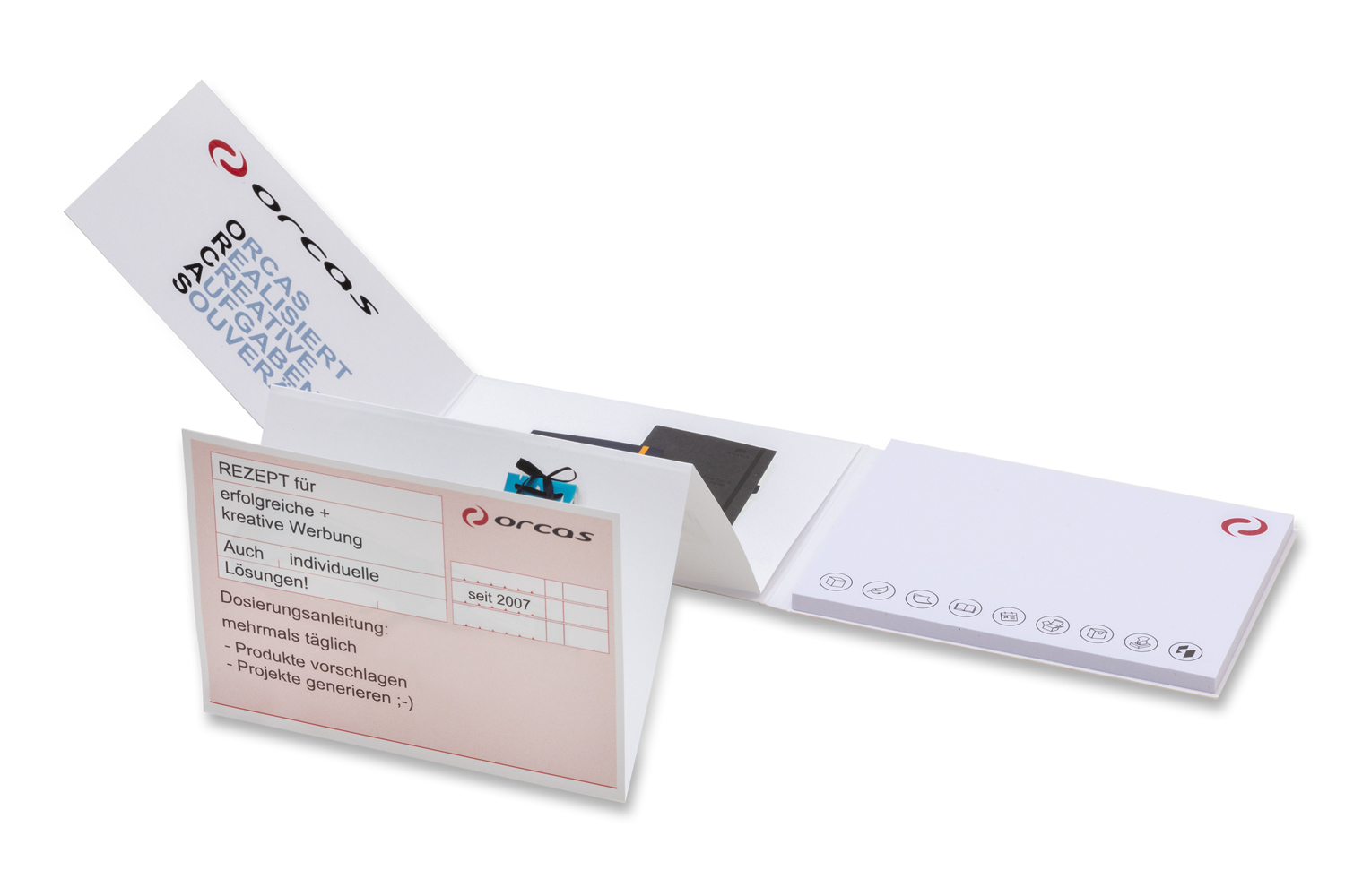 Kartoncover-Leporello seitlich zu öffnen, mit Haftnotizen + Leaflet.Haftnotizen innen rechts mit 50 Blatt 10 x7,5 cm, weiß, 80g und 2-farbigem Druck, einseitig. Leaflet gefaltet mit 7 Druckflächen à 10 x 7,5 cm, Bilderdruckpapier 130g und 4-farbigem Druck, beidseitig. Kartoncover mit 4-farbigem Druck. Einzeln mit Banderole verschlossen.