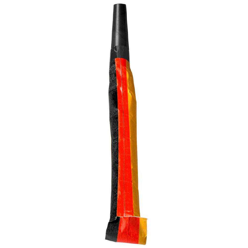 Klassische, lautstarke Tröte aus Kunststoff mit langem Papierrüssel, der sich beim Reinblasen ausrollt. Die Tröte ist schwarz und der Papierrüssel schwarz, rot, gelb. Zu 11 Stück im Polybeutel mit Papiereinleger verpackt.
