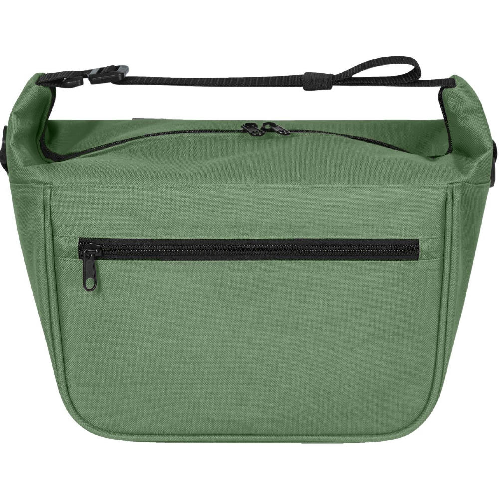 moderne Kühltasche; Hauptfach mit 2-Wege-Reißverschluss; großzügige Polsterung; innen abwaschbar; einseitig lösbarer, längenverstellbarer Träger mit Gummilasche zur Gurtfixierung; beidseitig D-Ringe zu Befestigung z.B.: für optionalen Schultergurt* oder Schlüssel; Bodenfüße; rückseitig Schlaufen zur Befestigung am Fahrradlenker