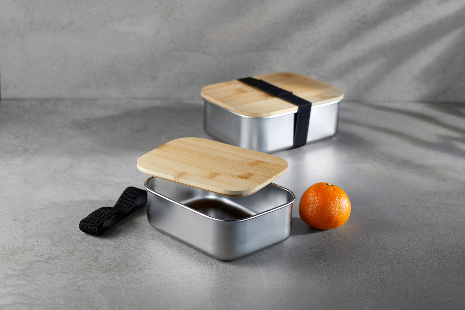 Edelstahl-Lunchbox 1,35L mit Bambusdeckel und elastischem Halteband. Spülmaschinengeeignet (mit Ausnahme des Deckels). Auch in der Größe S /1,0 L erhältlich.