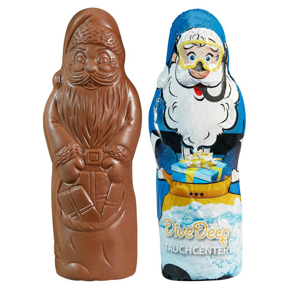Schoko-Weihnachtsmann, Hohlfigur, einzeln in individuell bedruckte Alufolie (weiß, silber oder gold) gewickelt. Inhalt: 1 Stück à  ca. 40 g.