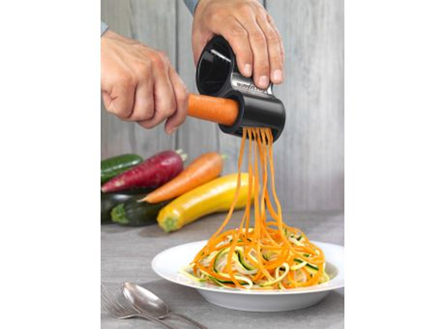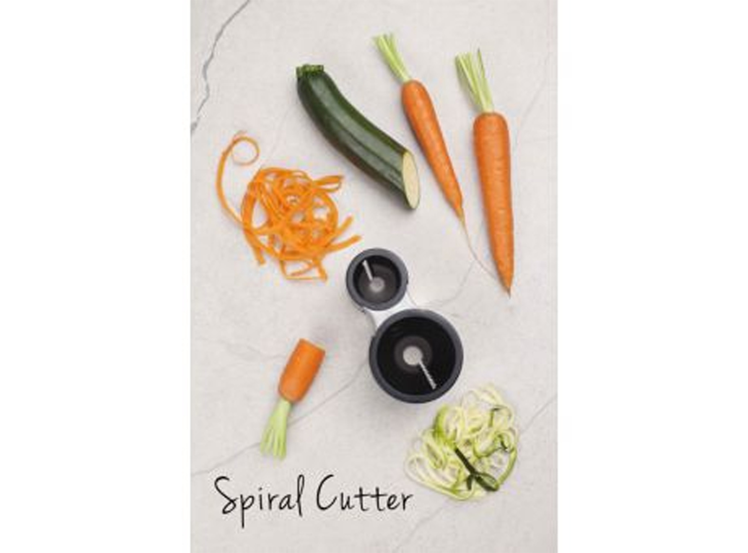 Geformt wie ein Bleistiftanspitzer lassen sich mit diesem praktischen Küchenhelfer frische Zucchini, Möhren, Gurken, Rettich und andere längliche Gemüsesorten in endlos lange Spiralen und Streifen schneiden. Zwei scharfe Klingen aus chirurgischem Edelstahl. Als würde man eine Möhre anspitzen, wird sie in die kleine oder große Öffnung geführt und gedreht, so dass endlose Spiralen entstehen.