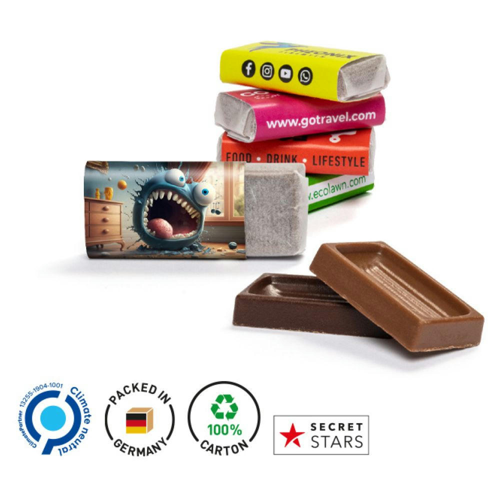 Napolitain Schokoladentäfelchen in Pergaminpapier mit weißer Papierbanderole, individuell bedruckt. Inhalt: Alpenvollmilchschokolade in feinster Qualität mit Fairtrade-Zutaten, eingewickelt in Pergaminpapier (kann über die Papiertonne entsorgt werden), 3 g