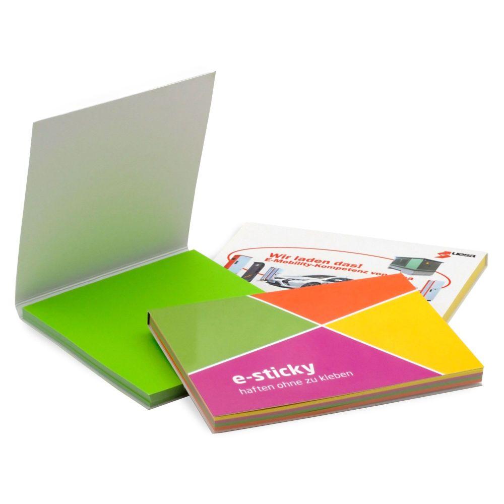 Haften ohne zu kleben: elektrostatische Notizzettel aus PP Folie haften auf fast jeder glatten Oberfläche wie Kunststoff, Holz, Wänden. 100 Blatt im Kartoncover-Umschlag. Umschlag weiß, 4c-bedruckbar; Notizzettel in 5 Standardfarben verfügbar. Preis inkl. Werbeanbringung.