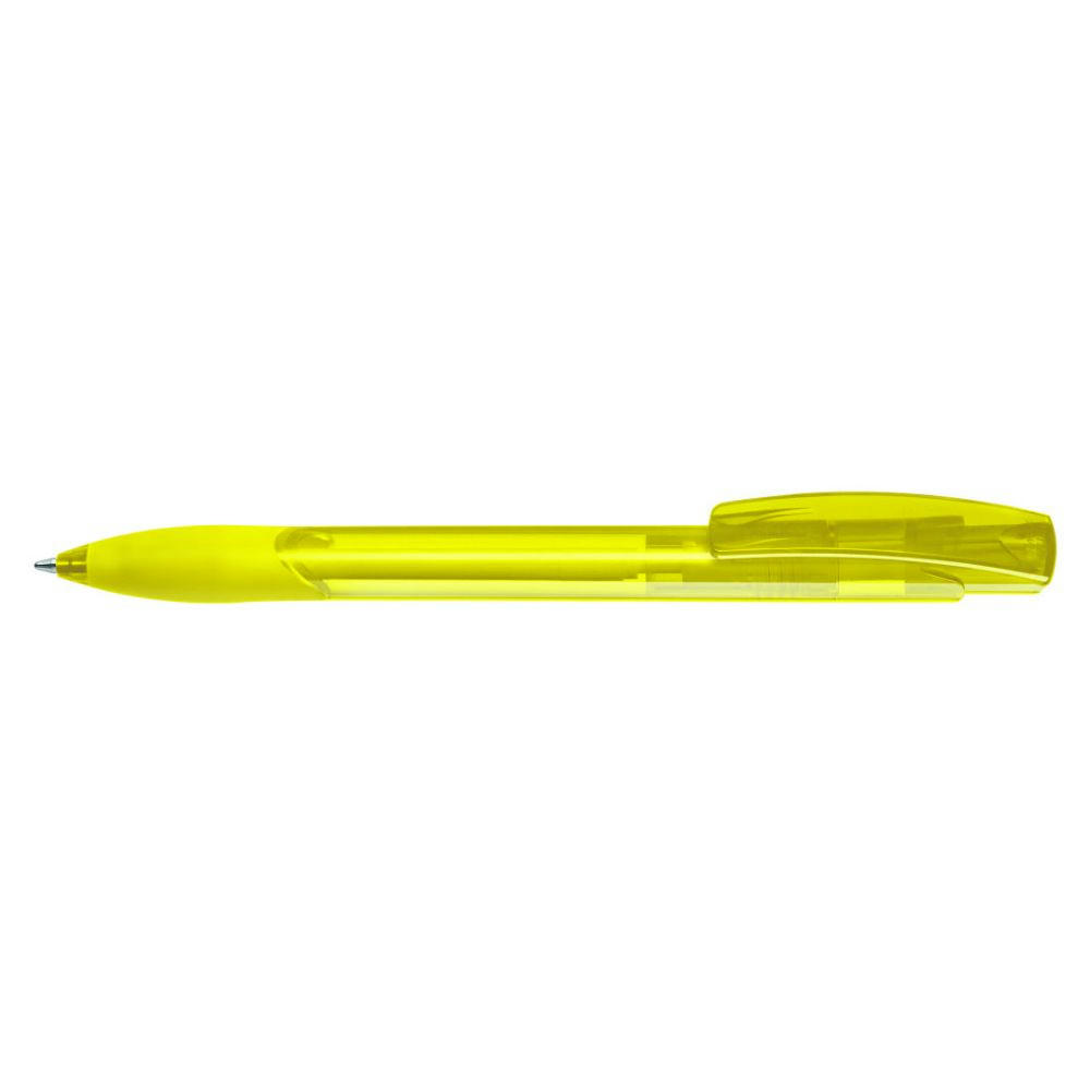 Druckkugelschreiber mit transparent glänzendem Schaft, Gummigriffzone und Clipdrücker.