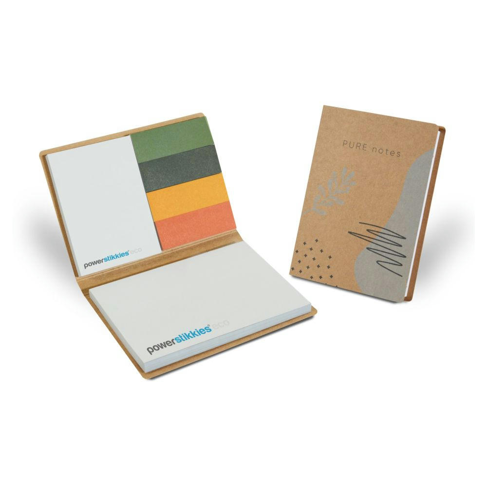 Haftset mit Umschlag aus natürlich braunem Karton. Zwei Recycling Haftnotizen (5 x 7 cm à 50 Blatt und 10 x 7 cm à 50 Blatt) und vier individuell gestaltbare Papiermarkern.