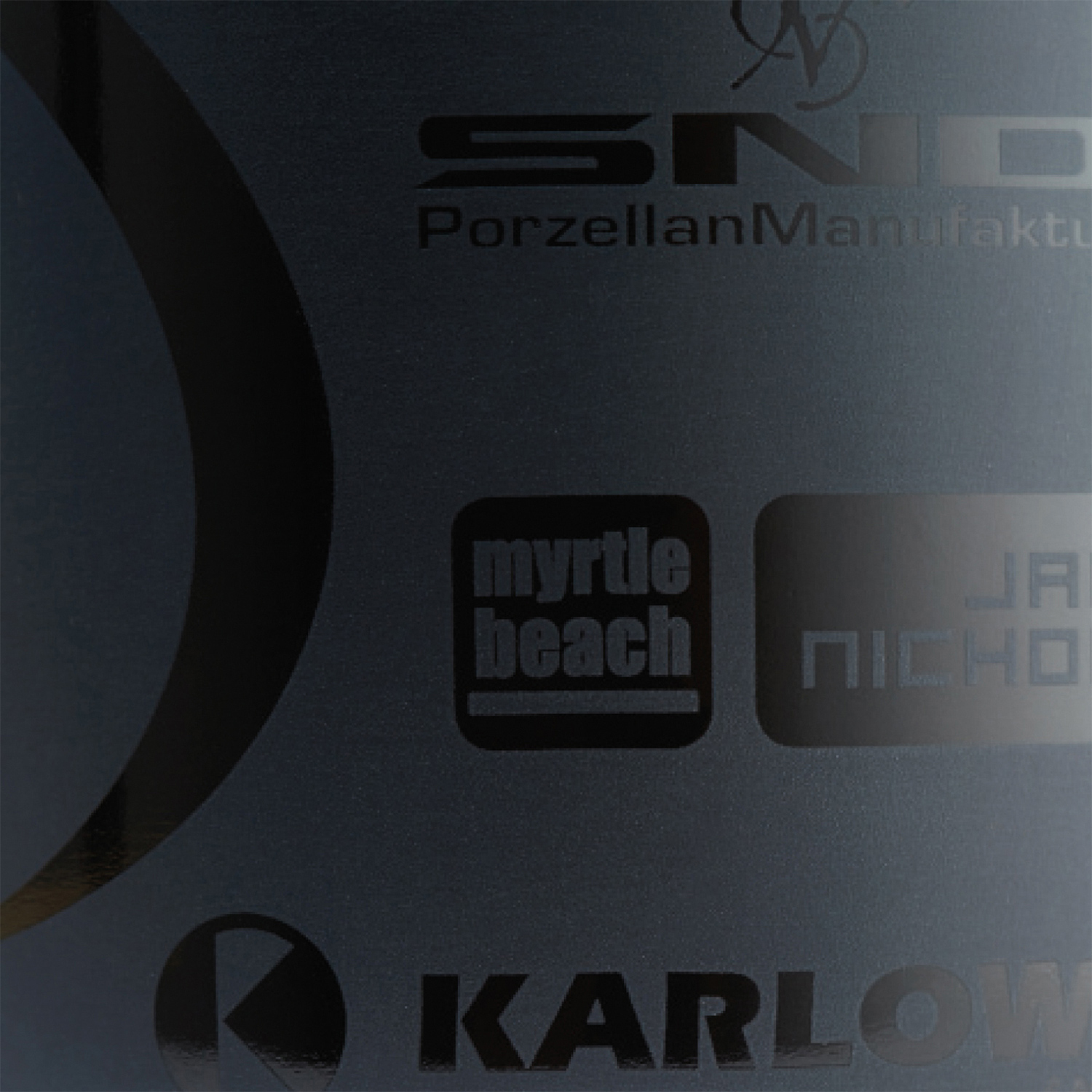 Transfer Druck als Teil- und Volldekor, Relief Weiß Druck (partiell erhabener Druck), Matt & Glanz Druck, Edelmetalldruck, Effektpigment Druck, Gravur, Hydrolack (farbige Lackierung), Softtouch, Personalisierung, Gastro Spritzung und Druck