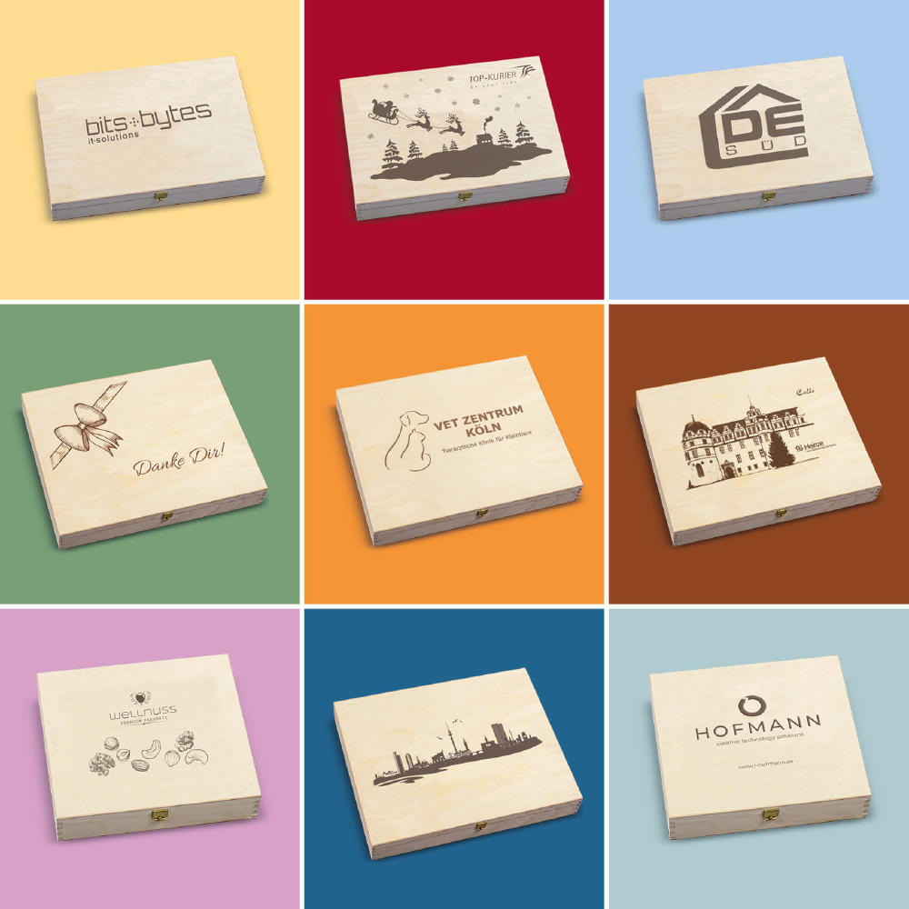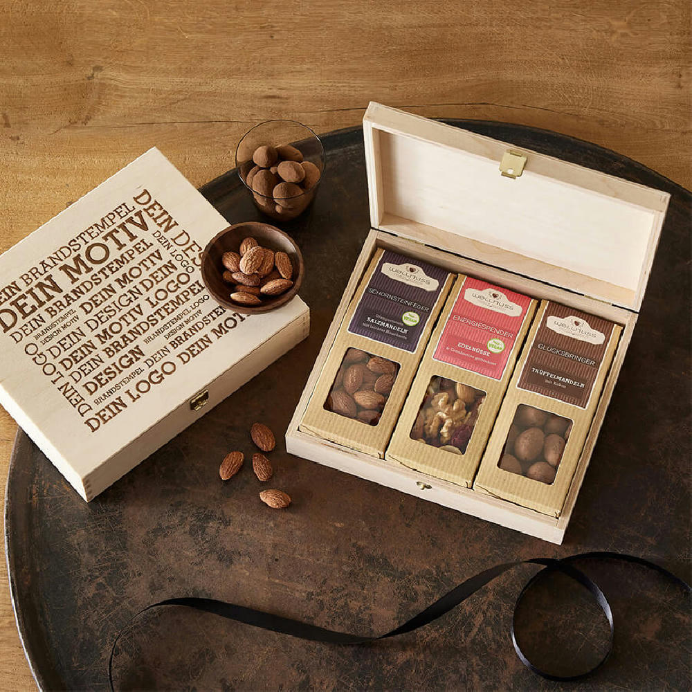 Verschenken Sie die Vielfalt verschiedenster Snacks rund um die Nuss – veredelt mit feinster Schokolade, würzig oder pur sowie in Kombination mit der herrlichen Süße von leckeren Trockenfrüchten. Deckel der Box mit Ihrem individuellen Design veredelbar. In weiteren Größen erhältlich.