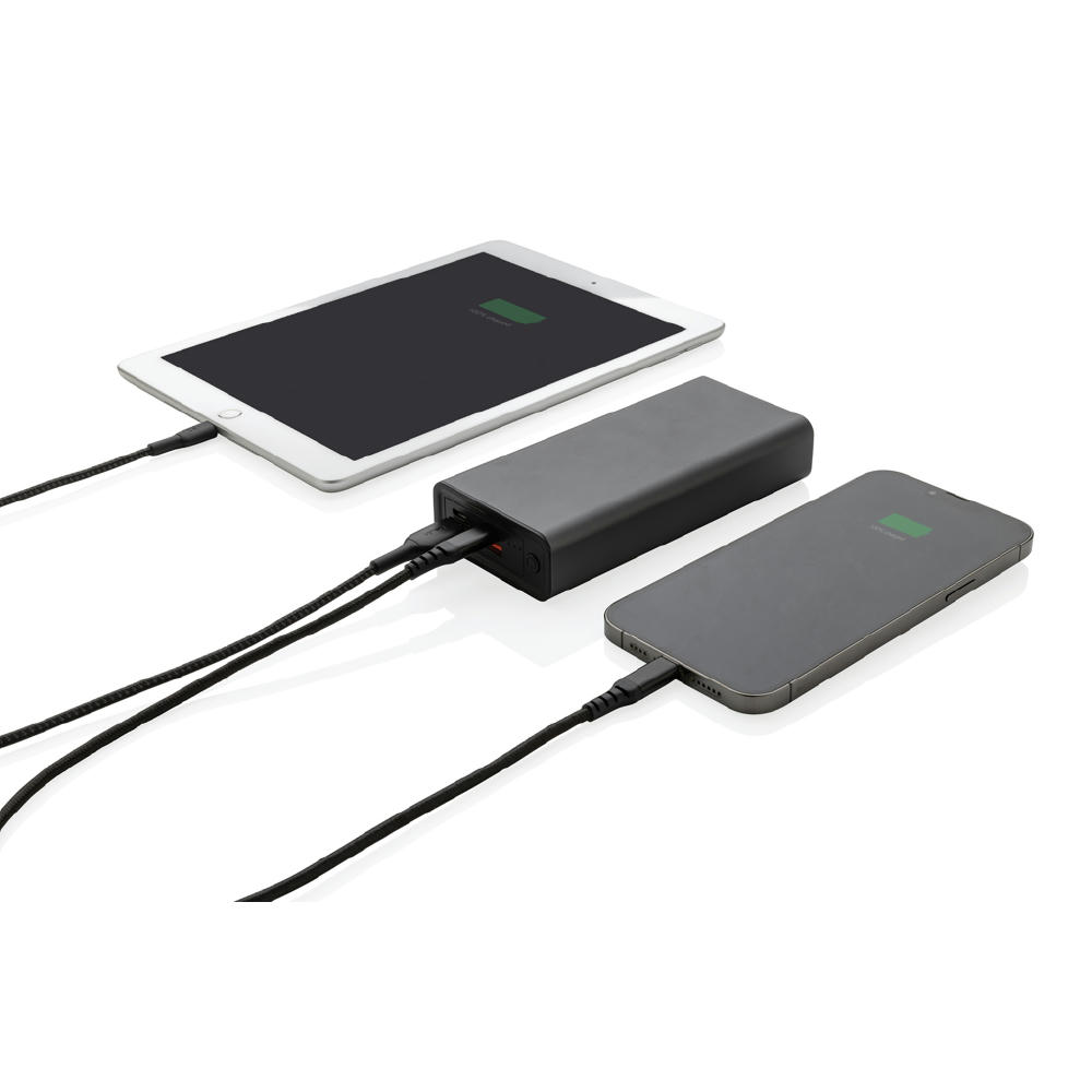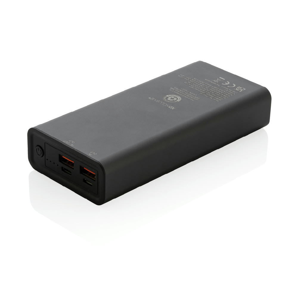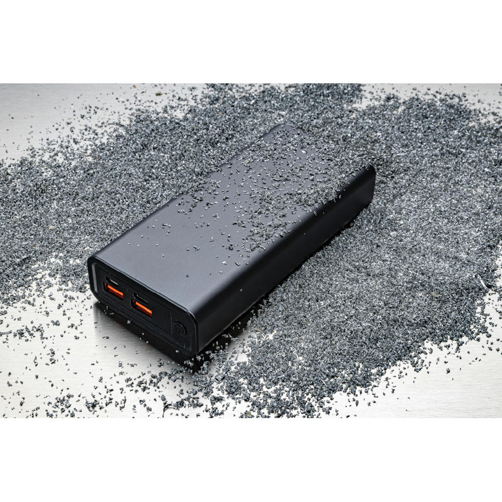 Diese ultraschnelle Powerbank mit langlebigem A-Grade Lithium-Polymer-Akku mit 20.000mAh ist aus RCS (Recycled Claim Standard)-zertifiziert recyceltem Aluminium & ABS hergestellt. Gesamter Recyclinganteil: 21% basierend auf dem Gesamtgewicht des Artikels. Die RCS-Zertifizierung gewährleistet eine vollständig zertifizierte Lieferkette der recycelten Materialien. Aluminium verliert seine Eigenschaften im Recyclingprozess nicht und kann daher endlos recycelt werden. Der Type-C-Ausgang unterstützt schnelles Aufladen bis zu 18W und auch schnelles Aufladen innerhalb von 5 Stunden. Mit zwei USB-A Outputs und Ladestandsanzeigen. Artikel und Zubehör 100% PVC-frei. Inklusive Type-C-Ladekabel aus RCS-zertifiziert recyceltem Aluminium, TPE und PET. Verpackt in FSC®-Mix-Verpackung. Für das Handgepäck von Fluggesellschaften zugelassen (74 Wh). USB-Output 5/3A, 9V/2A, 12V/1,5A. Type-C Output: 5V/3A, 9V/2A, 12V/1,5A. Type.C Input: 5V/3A, 9V/2A, 12V/1,5A. Micro-USB-Input: 5V/2A, 9V/2A, 12V/1.5A.