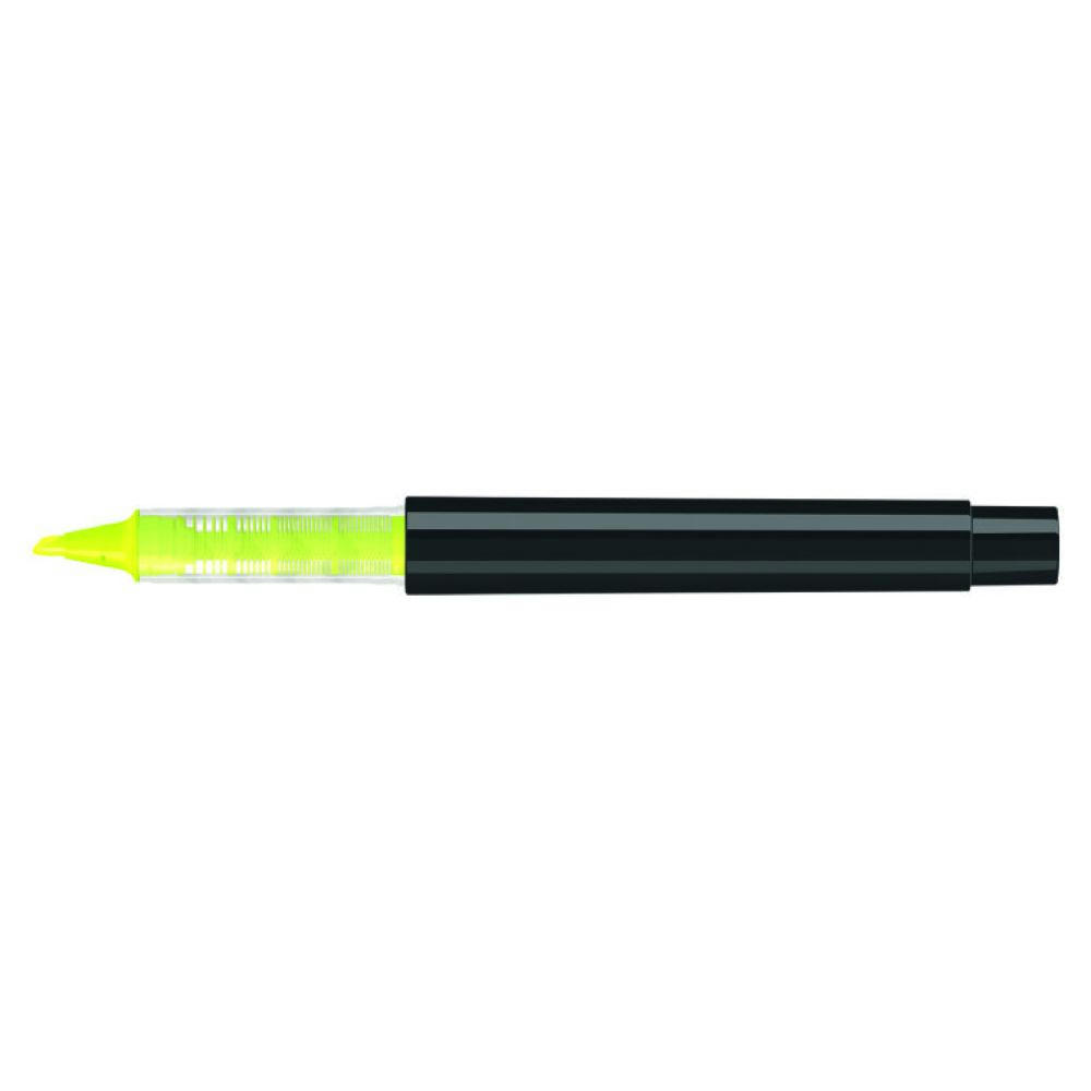 Flüssig-Textmarker mit Gehäuse aus recyceltem PET-Material in gedeckt glänzend weiß oder schwarz. Stopfen in den 6 möglichen Schreibfarben.
