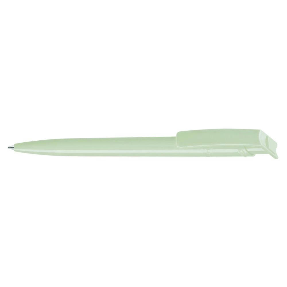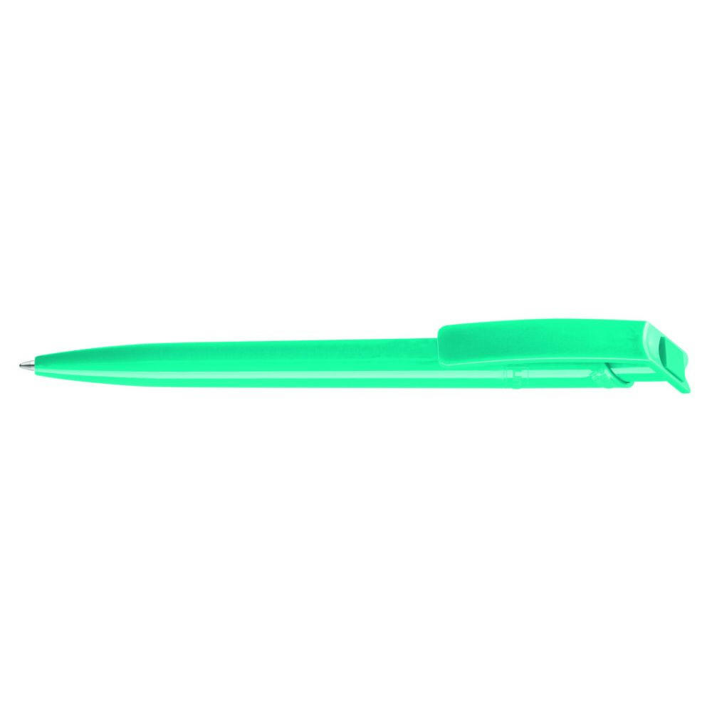 Druckkugelschreiber aus recyceltem PET-Material mit gedeckt glänzendem Gehäuse und Stopfen.