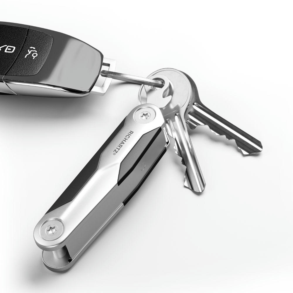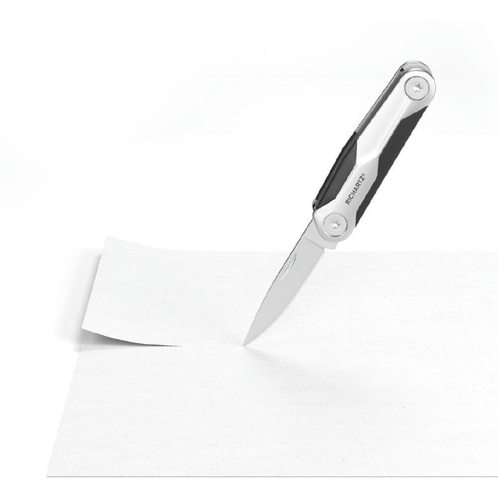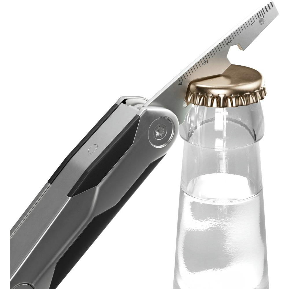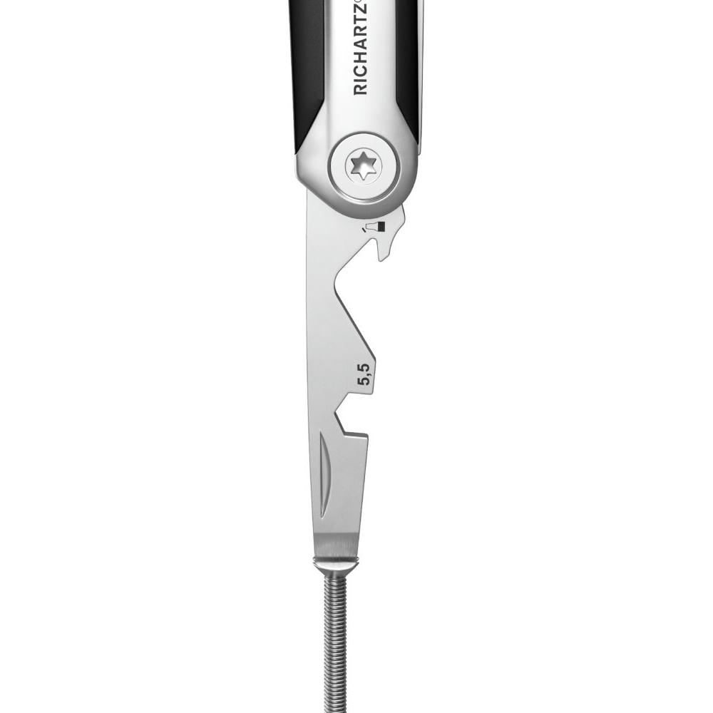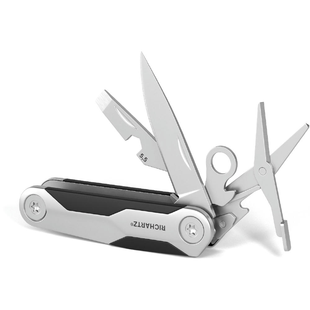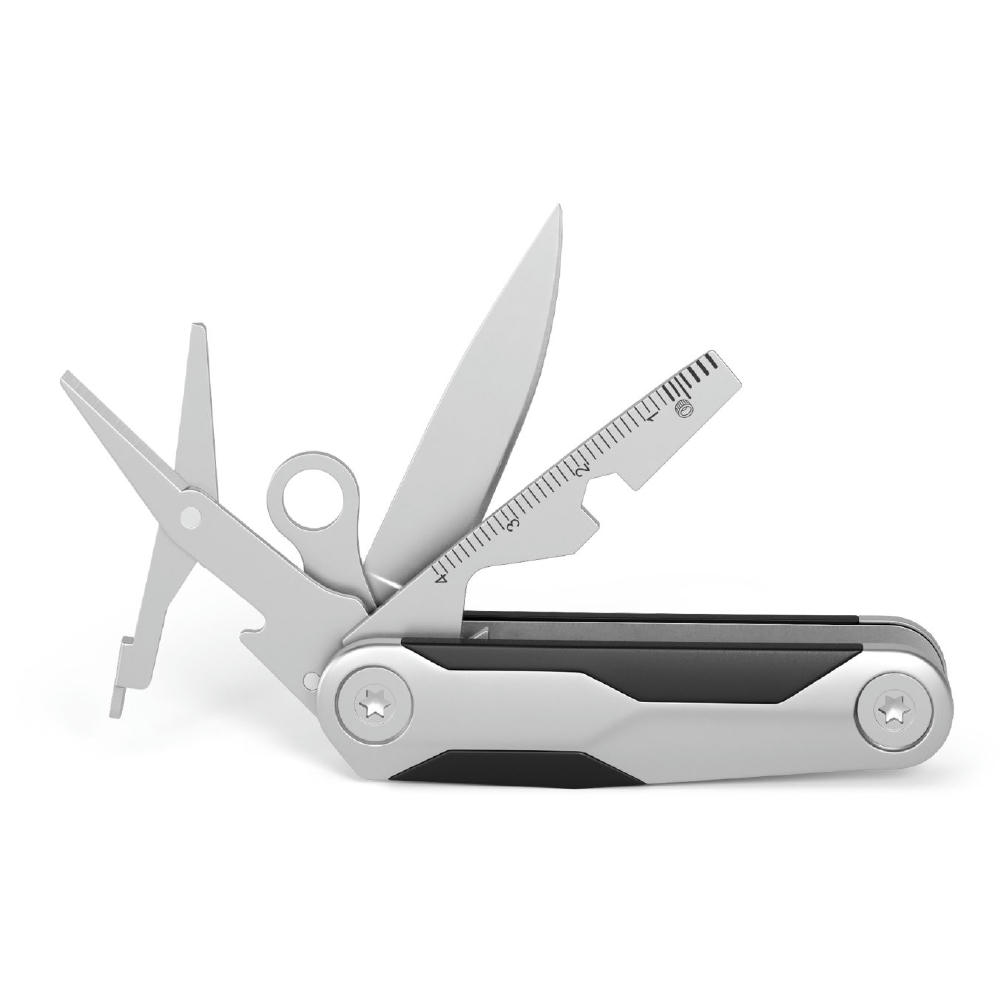 Kleines Taschenmesser mit 8 alltagstauglichen Funktionen: Kapselheber, Klinge, Profiltiefenmesser, Ringöse, Schere, Schlitzschraubendreher, Sechskantschlüssel, Zentimetermaß.