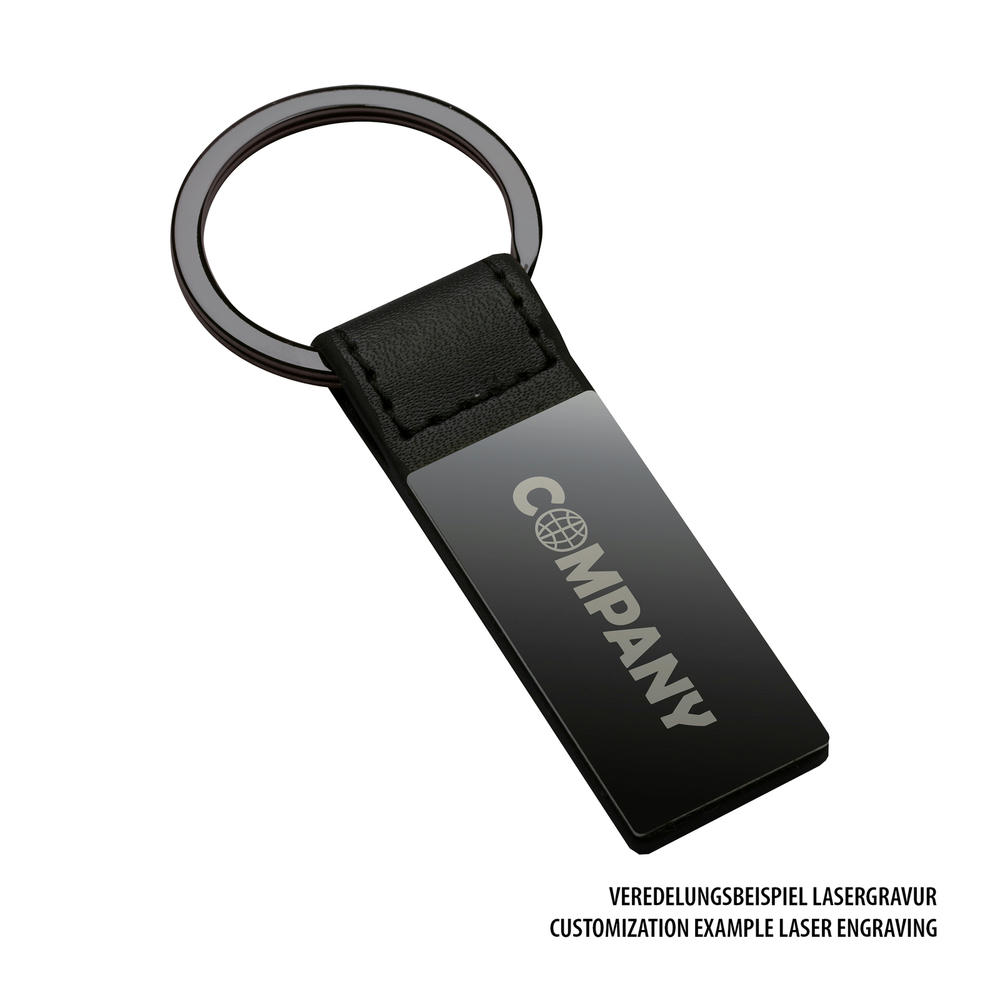 Der Schlüsselanhänger ist aus schwarzem Kunstleder und zeigt eine schwarzglänzende Gunmetal-Plattierung auf dem veredelbaren MeDer Schlüsselanhänger ist aus schwarzem Kunstleder und zeigt eine schwarzglänzende Gunmetal-Plattierung auf dem veredelbaren Metallstück des Anhängers. Die Individualisierungsmethode der Wahl ist eine edle und hochwertige Lasergravur, die den Anhänger zu einem echten Prachtstück werden lässt.