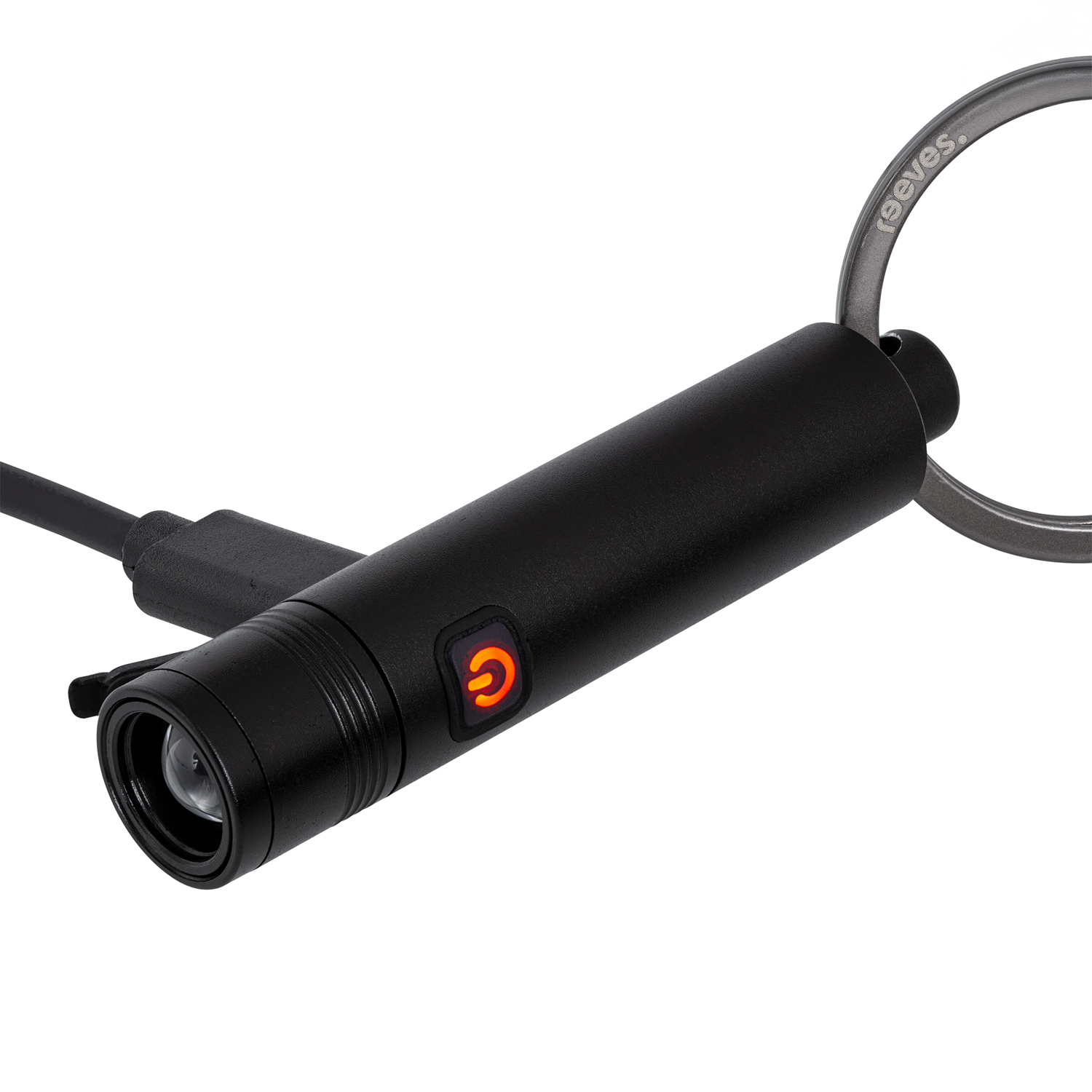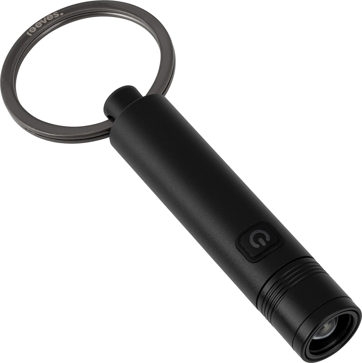 Schlüsselanhänger mit wiederaufladbarer LED-Taschenlampe (80 Lumen) mit USB-C-Anschluss aus schwarz eloxiertem Aluminium . Verstellbare Lichtintensitäten (zoombar auf 50% oder 100% Leuchtkraft). Leuchtdauer: 30 Minuten bei 100% Leuchtkraft; 75 Minuten bei 50% Leuchtkraft. 2,5 Stunden Ladezeit, 120 mAh Akku. Spritwassergeschützt IPX4. Inklusive USB-C-Ladekabel und Geschenkverpackung.
