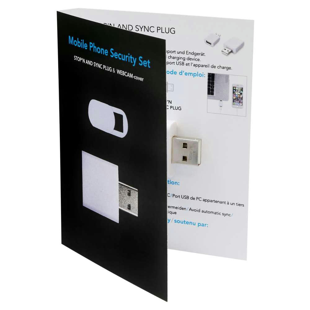 Schützen Sie Ihre Privatsphäre! Set bestehend aus Webcam Cover, Stop`n Sync Stecker auf einer Trägerkarte – Standard oder optional individuell bedruckt.