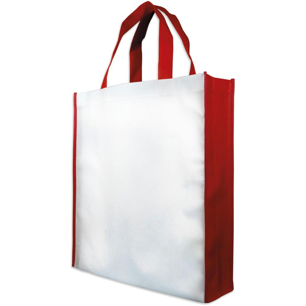 Shopperbag "PP Non Woven" weiß/rot, Boden- und Seitenfalte, 2 kurze Henkel, Henkel und Seitenfalte in rot Topqualität: ca. 90 gr. pro qm, Produktdetails: Artikelgröße: 38 x 42 x 10 cm Henkellänge: ca. 45 x 3 cm Material: 100% Polypropylen Qualität: ca. 90 gr. pro qm