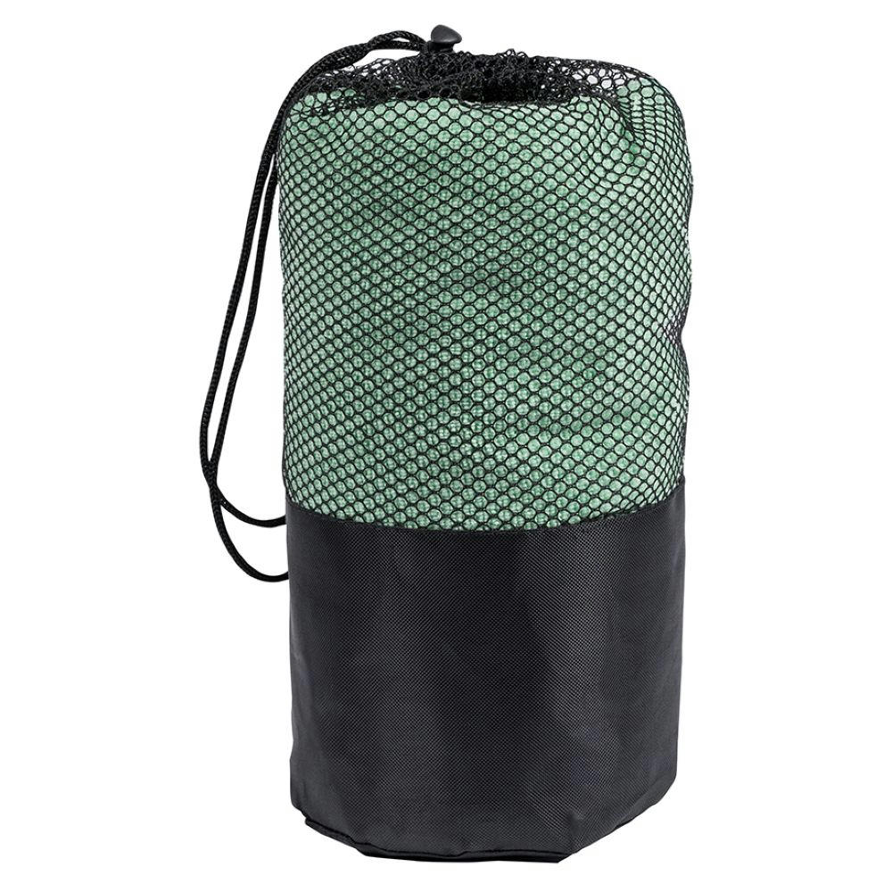 Großes Sporthandtuch aus 85% Polyester und 15% Polyamid (Mikrofaser-Frottee 280 g/m²) stark absorbierendin einem schwarzen Netzbeutel mit Infobanderole, die auf Wunsch selbst gestaltet werden kann.