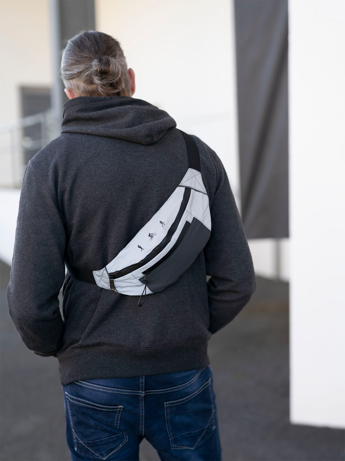 Gürteltasche mit 3 Reißverschlussfächern, reflektierend, kann über die Brust, den Rücken oder um die Hüfte getragen werden, Hauptfach, Frontfach, rückseitiges Geheimfach, Reißverschlüsse gummiert, spritzwassergeschützt (Wasserdichtheitsgrad IPX4), verstellbarer Gurt, gepolsterte Rückseite.