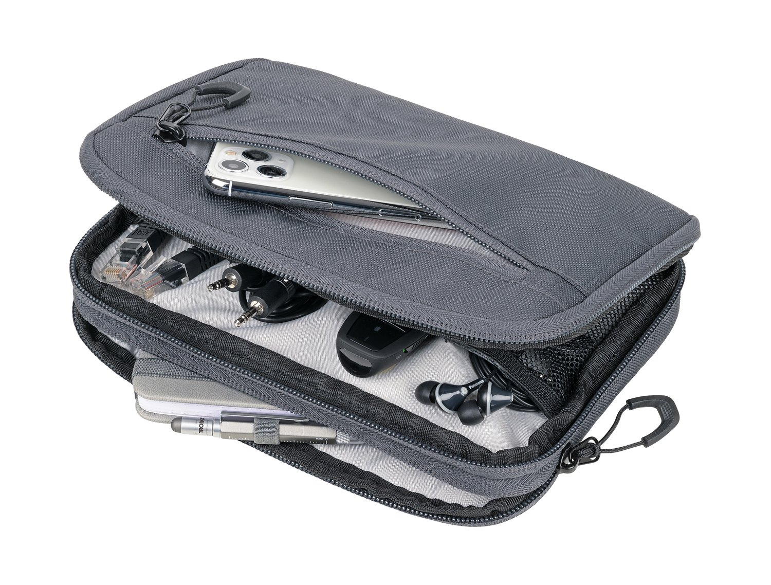 Kabeltasche für Elektronikzubehör, 1 Fach mit 2-Wege Reißverschluss und 6 Netzfächern in 2 verschiedenen Größen, Hauptfach inkl. Geheimfach für mini Tracking-Geräte (z.B. APPLE AirTag®), Einschubfach, Außentasche mit Reißverschluss.