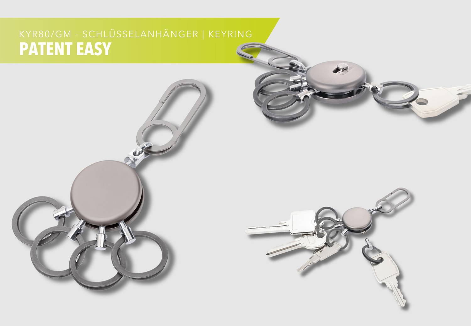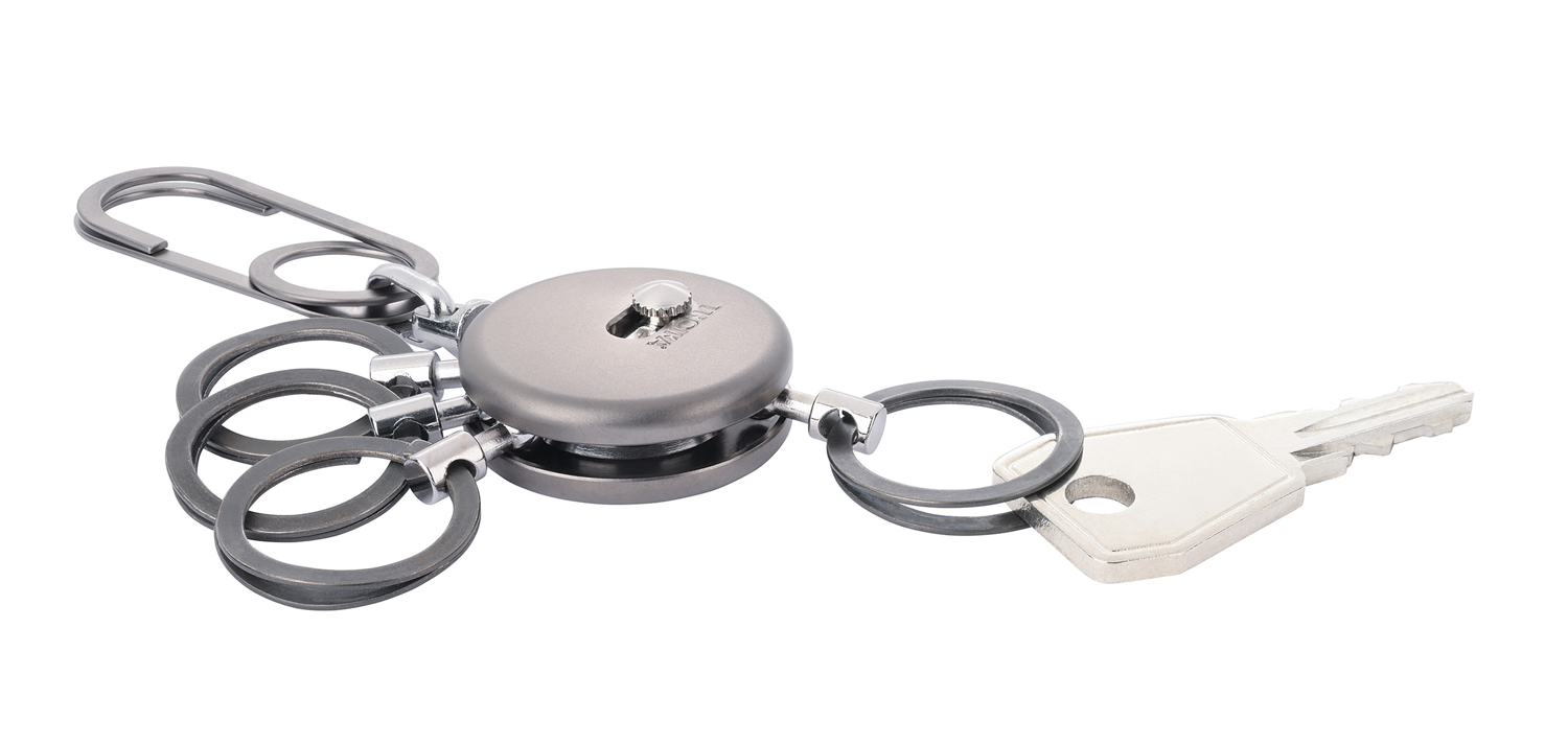 Schlüsselanhänger, rund, inkl. Karabinerhaken, 4 ausklinkbare Ringe, schnelles & einfaches Anbringen der Schlüssel dank patentiertem Öffnungsmechanismus (Nail Guard), Messing, Metall, verchromt, matt, gunmetal.