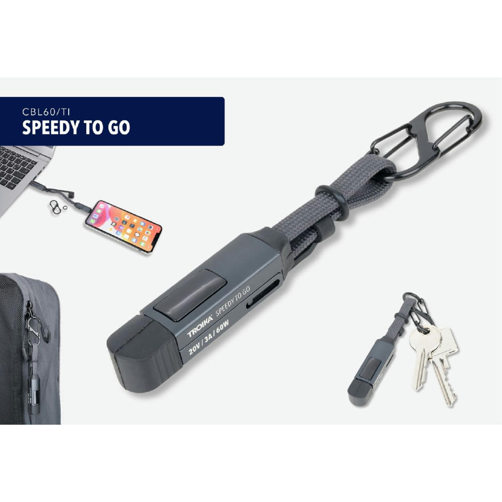 Taschenanhänger mit Ladekabel: High-Speed USB-C 60W PD Power Delivery auf USB-C, mit Datenübertragungsfunktion, volle Ladekapazität: max. 60W|20V|3A (ohne Adapter), abhängig vom zu beladenen Gerät, mit digitaler Anzeige der Ladeleistung, inkl. USB-C auf Lightning Adapter, mit Doppelkarabiner zur Befestigung an Schlüsselbund, (Sport-)Tasche o.Ä., mit Magnetverschluss und Kappe.