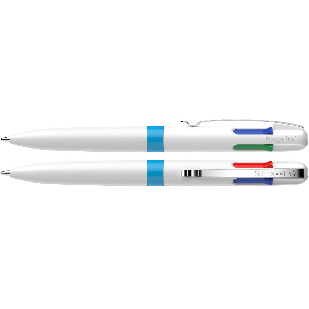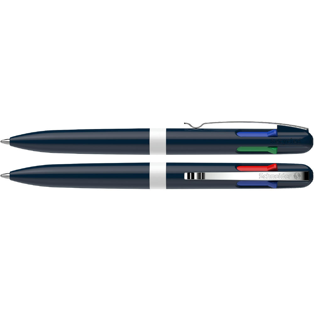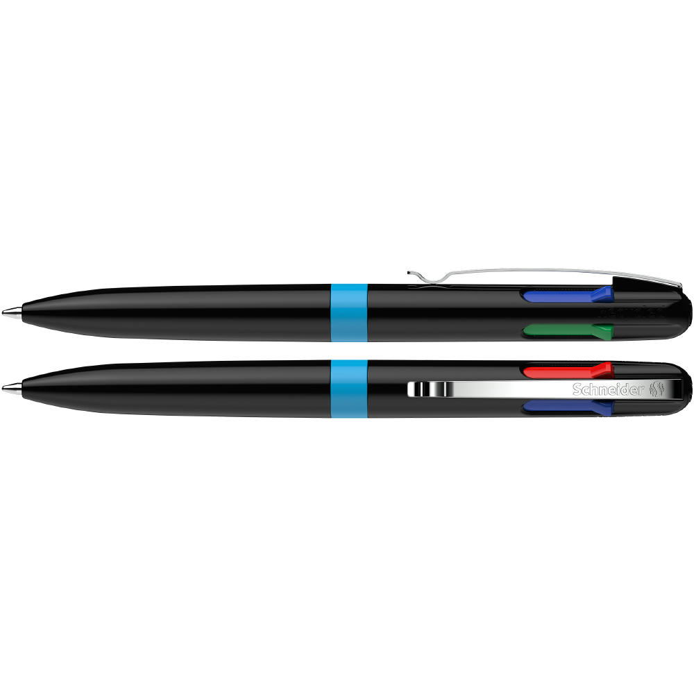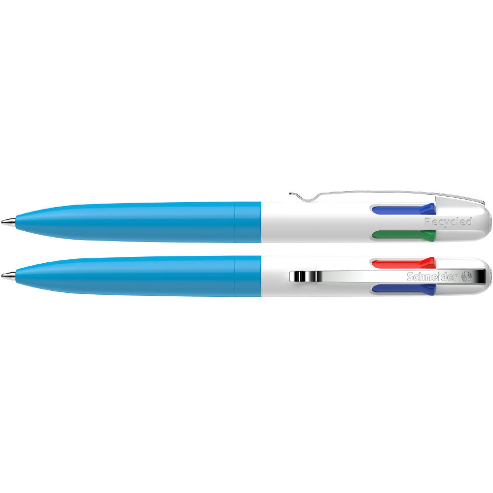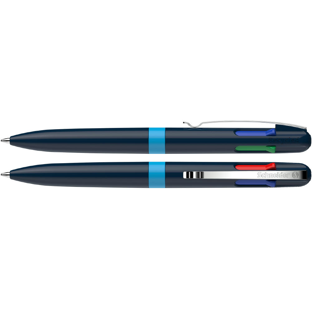 Vierfarb-Kugelschreiber mit den Schreibfarben schwarz, rot, blau und grün. Schneller und komfortabler Farbwechsel durch farbige Schieber. Umwelt- und ressourcenschonend mit einem *Gehäuse aus 92 % Recycling-Kunststoff. Stabiler Metallclip. Mit Viscoglide®-Technologie für außergewöhnlich weiches und gleitendes Schreiben. Strichstärke Medium (M). Nachfüllbar mit Schneider-Mine „Take 4 Refill“. Produkt mit finanziellem Klimabeitrag: Kompensation in Höhe der unvermeidbaren Emissionen in ein zertifiziertes Klimaschutzprojekt. Gehäuse: tiefblau/cyan . Schreibfarbe: schwarz + rot + grün + blau.
