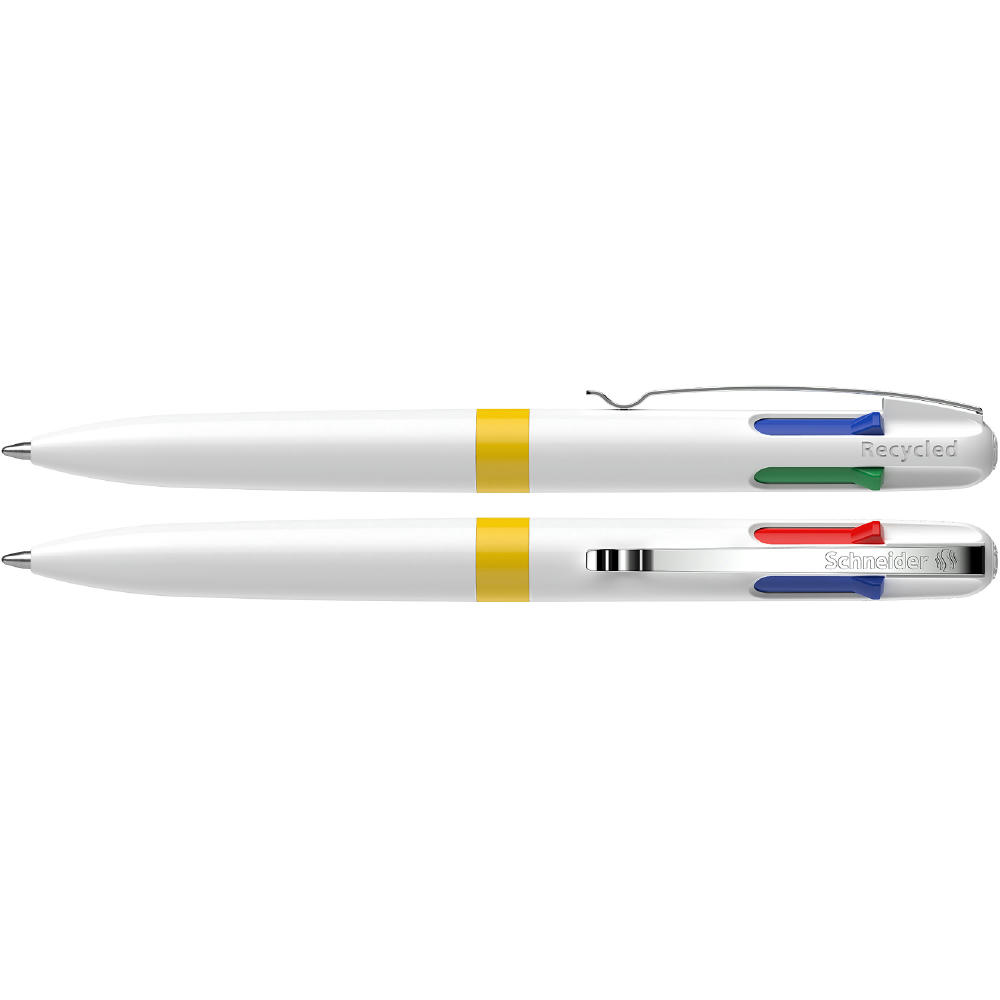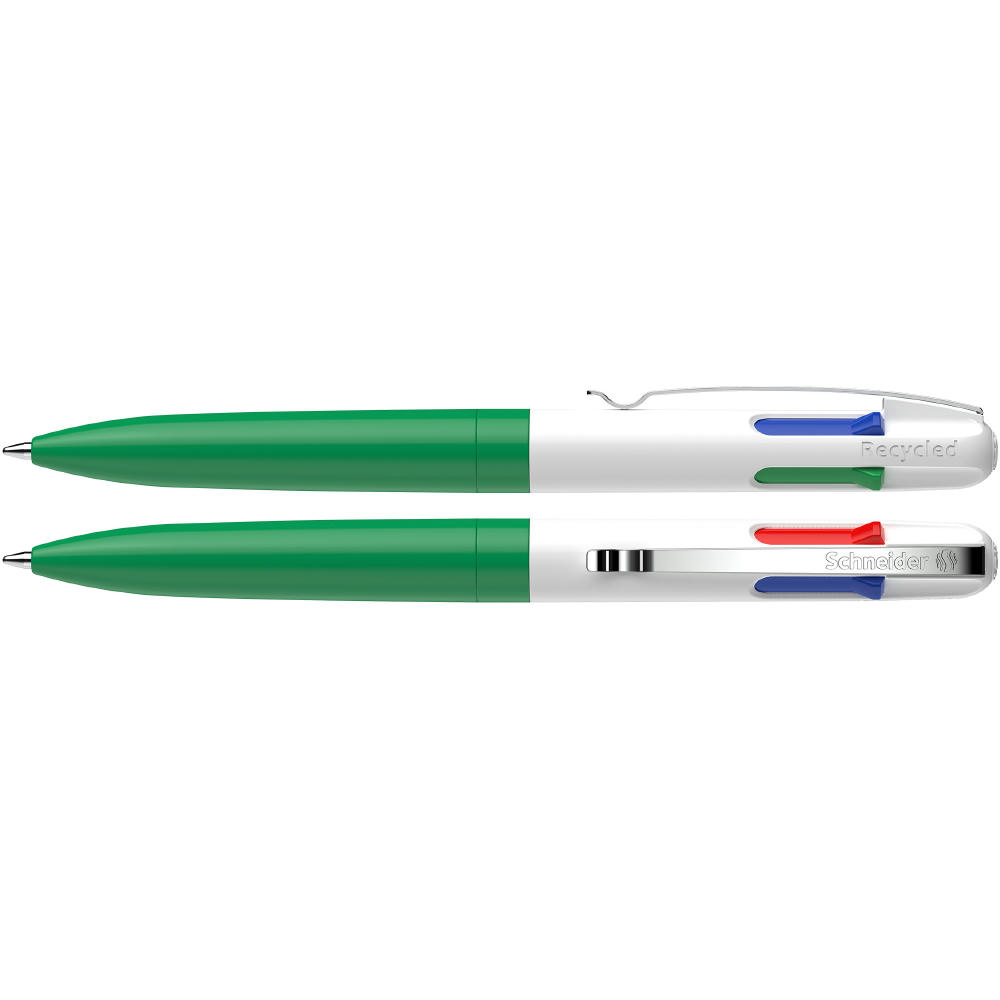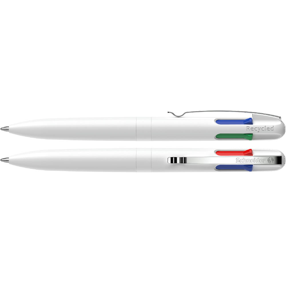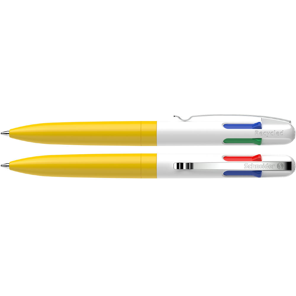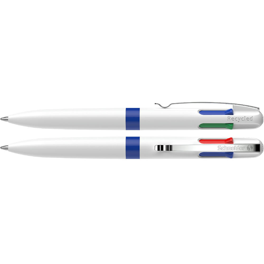 Vierfarb-Kugelschreiber mit den Schreibfarben schwarz, rot, blau und grün. Schneller und komfortabler Farbwechsel durch farbige Schieber. Umwelt- und ressourcenschonend mit einem *Gehäuse aus 92 % Recycling-Kunststoff. Stabiler Metallclip. Mit Viscoglide®-Technologie für außergewöhnlich weiches und gleitendes Schreiben. Strichstärke Medium (M). Nachfüllbar mit Schneider-Mine „Take 4 Refill“. Produkt mit finanziellem Klimabeitrag: Kompensation in Höhe der unvermeidbaren Emissionen in ein zertifiziertes Klimaschutzprojekt. Gehäuse: tiefblau/cyan . Schreibfarbe: schwarz + rot + grün + blau.